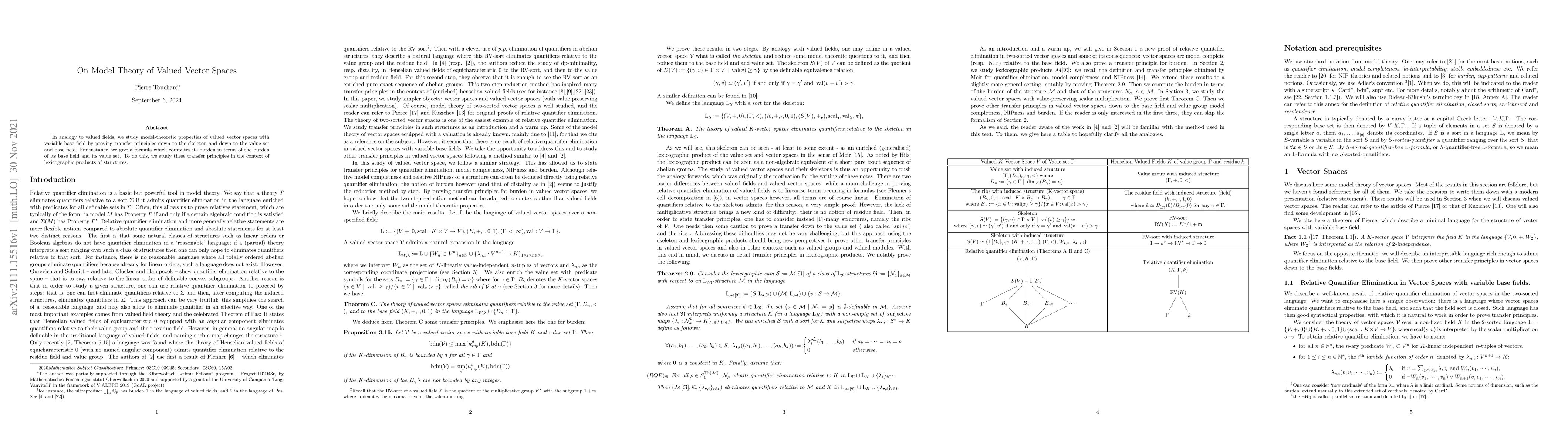 In analogy to valued fields, we study model-theoretic properties of valued vector spaces with variable base field by proving transfer principles down to the skeleton and down to the value set and base field. For instance, we give a formula which computes its burden in terms of the burden of its base field and its value set. To do this, we study these transfer principles in the context of lexicographic products of structures.