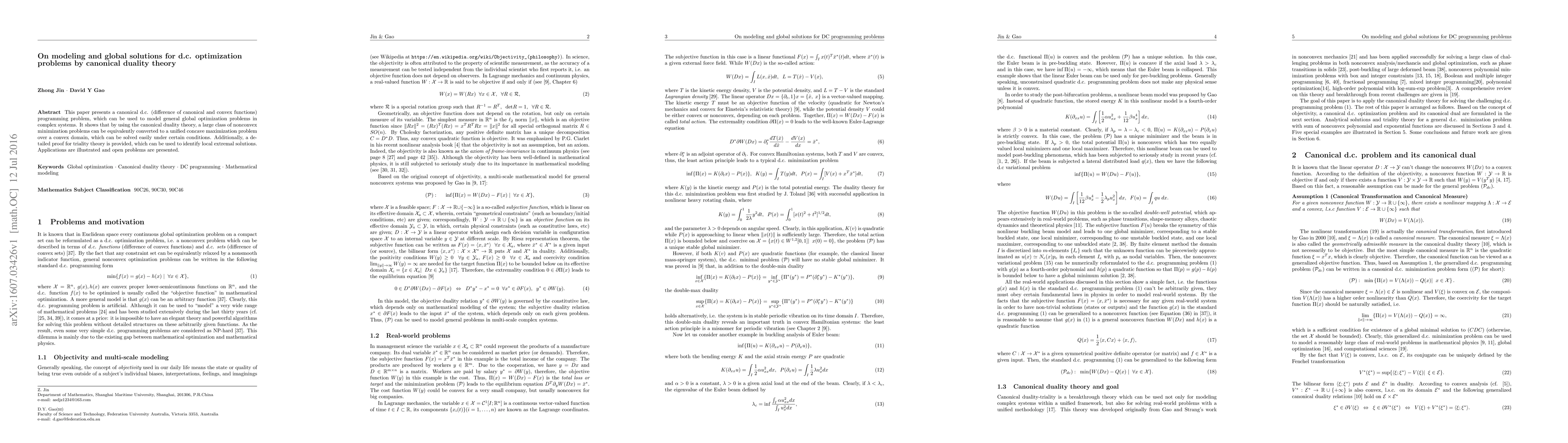 This paper presents a canonical d.c. (difference of canonical and convex functions) programming problem, which can be used to model general global optimization problems in complex systems. It shows that by using the canonical duality theory, a large class of nonconvex minimization problems can be equivalently converted to a unified concave maximization problem over a convex domain, which can be solved easily under certain conditions. Additionally, a detailed proof for triality theory is provided, which can be used to identify local extremal solutions. Applications are illustrated and open problems are presented.