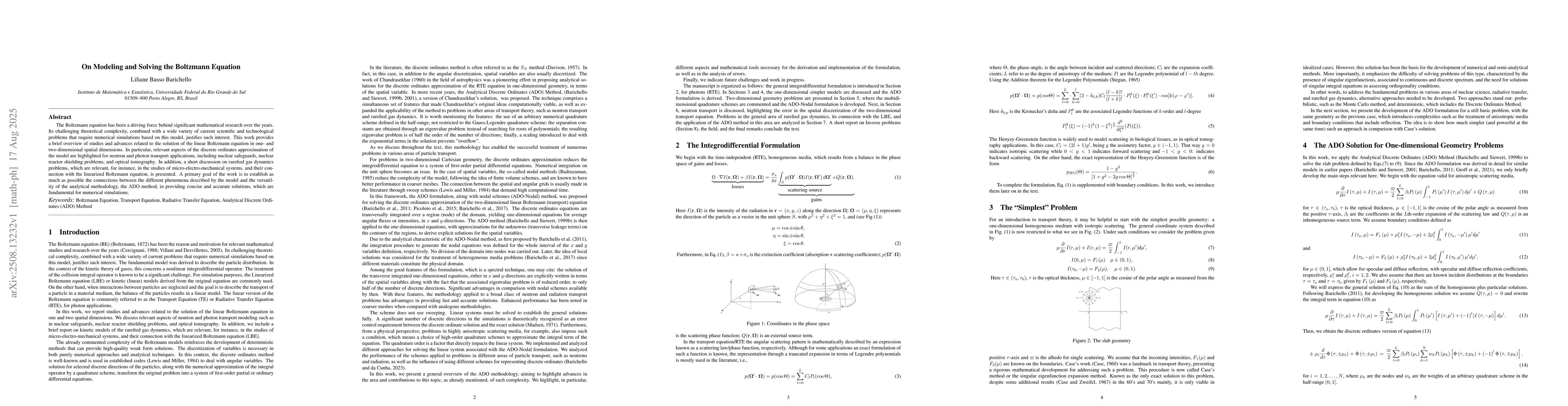 The Boltzmann equation has been a driving force behind significant mathematical research over the years. Its challenging theoretical complexity, combined with a wide variety of current scientific and technological problems that require numerical simulations based on this model, justifies such interest. This work provides a brief overview of studies and advances related to the solution of the linear Boltzmann equation in one- and two-dimensional spatial dimensions. In particular, relevant aspects of the discrete ordinates approximation of the model are highlighted for neutron and photon transport applications, including nuclear safeguards, nuclear reactor shielding problems, and optical tomography. In addition, a short discussion on rarefied gas dynamics problems, which are relevant, for instance, in the studies of micro-electro-mechanical systems, and their connection with the linearized Boltzmann equation, is presented. A primary goal of the work is to establish as much as possible the connections between the different phenomena described by the model and the versatility of the analytical methodology, the ADO method, in providing concise and accurate solutions, which are fundamental for numerical simulations.