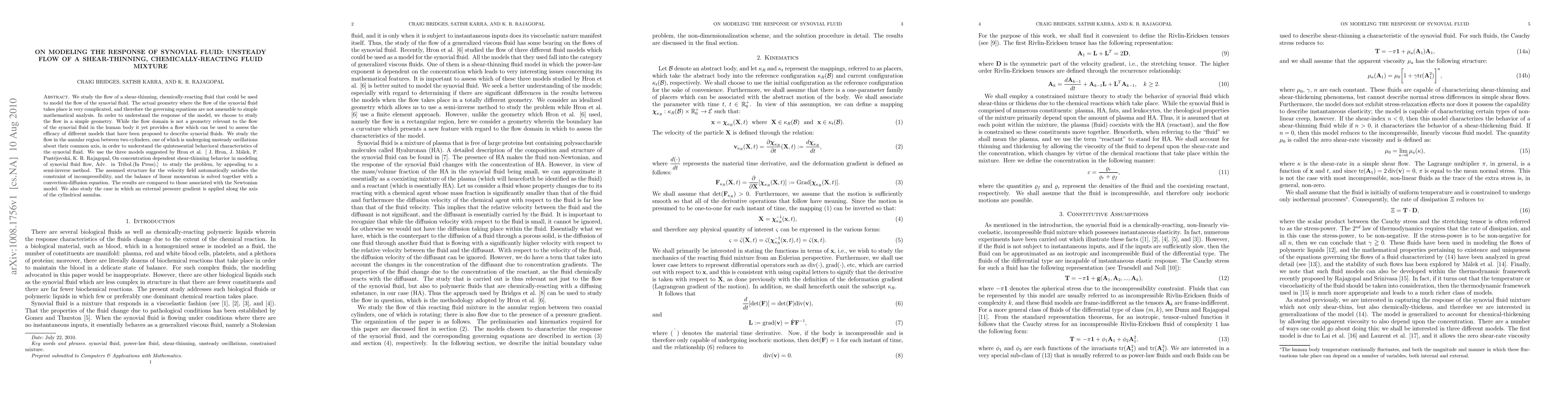 We study the flow of a shear-thinning, chemically-reacting fluid that could be used to model the flow of the synovial fluid. The actual geometry where the flow of the synovial fluid takes place is very complicated, and therefore the governing equations are not amenable to simple mathematical analysis. In order to understand the response of the model, we choose to study the flow in a simple geometry. While the flow domain is not a geometry relevant to the flow of the synovial fluid in the human body it yet provides a flow which can be used to assess the efficacy of different models that have been proposed to describe synovial fluids. We study the flow in the annular region between two cylinders, one of which is undergoing unsteady oscillations about their common axis, in order to understand the quintessential behavioral characteristics of the synovial fluid. We use the three models suggested by Hron et al. [ J. Hron, J. M\'{a}lek, P. Pust\v{e}jovsk\'{a}, K. R. Rajagopal, On concentration dependent shear-thinning behavior in modeling of synovial fluid flow, Adv. in Tribol. (In Press).] to study the problem, by appealing to a semi-inverse method. The assumed structure for the velocity field automatically satisfies the constraint of incompressibility, and the balance of linear momentum is solved together with a convection-diffusion equation. The results are compared to those associated with the Newtonian model. We also study the case in which an external pressure gradient is applied along the axis of the cylindrical annulus.