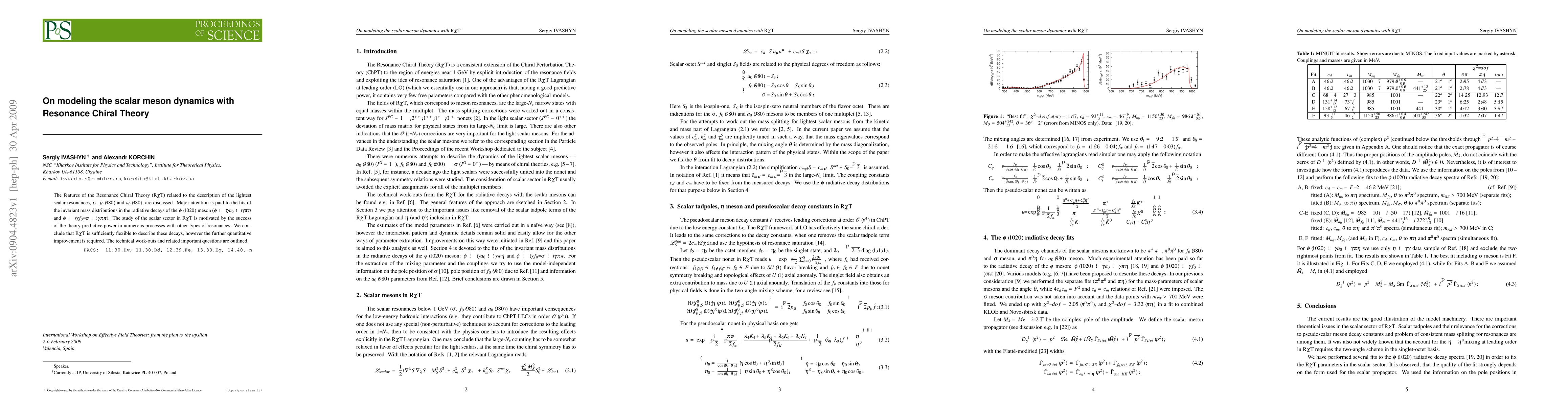 The features of the Resonance Chiral Theory (RChT) related to the description of the lightest scalar resonances, sigma, f0(980) and a0(980), are discussed. Major attention is paid to the fits of the invariant mass distributions in the radiative decays of the phi(1020) meson. The study of the scalar sector in RChT is motivated by the success of the theory predictive power in numerous processes with other types of resonances. We conclude that RChT is sufficiently flexible to describe these decays, however the further quantitative improvement is required. The technical work-outs and related important questions are outlined.