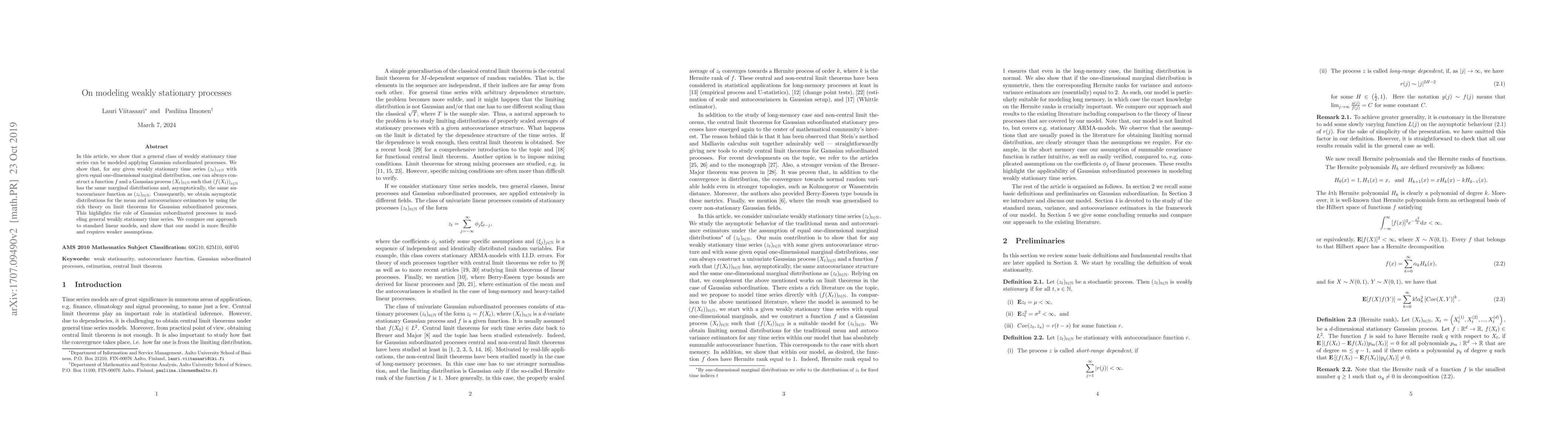 In this article, we show that a general class of weakly stationary time series can be modeled applying Gaussian subordinated processes. We show that, for any given weakly stationary time series $(z_t)_{z\in\mathbb{N}}$ with given equal one-dimensional marginal distribution, one can always construct a function $f$ and a Gaussian process $(X_t)_{t\in\mathbb{N}}$ such that $\left(f(X_t)\right)_{t\in\mathbb{N}}$ has the same marginal distributions and, asymptotically, the same autocovariance function as $(z_t)_{t\in\mathbb{N}}$. Consequently, we obtain asymptotic distributions for the mean and autocovariance estimators by using the rich theory on limit theorems for Gaussian subordinated processes. This highlights the role of Gaussian subordinated processes in modeling general weakly stationary time series. We compare our approach to standard linear models, and show that our model is more flexible and requires weaker assumptions.