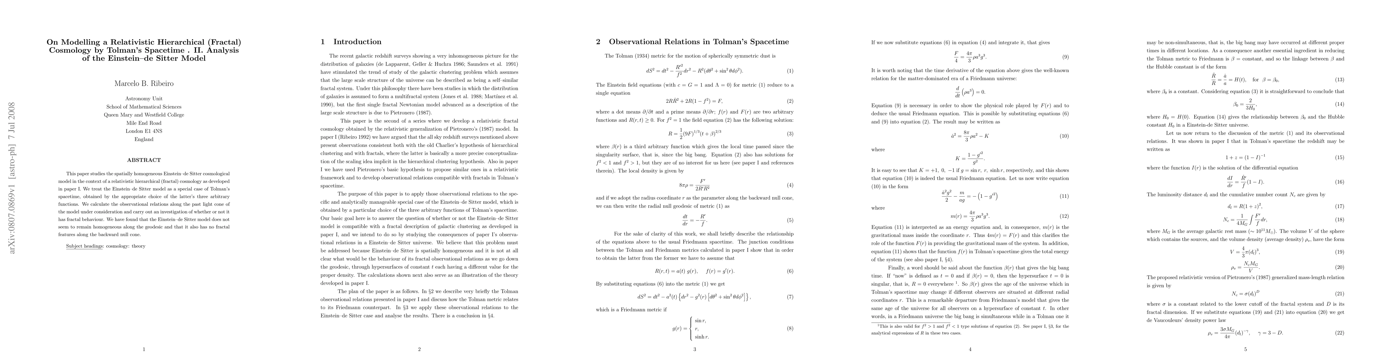 This paper studies the spatially homogeneous Einstein-de Sitter cosmological model in the context of a relativistic hierarchical (fractal) cosmology as developed in paper I (0807.0866). The Einstein-de Sitter model is treated as a special case of Lemaitre-Tolman's spacetime, obtained by the appropriate choice of the latter's three arbitrary functions. The observational relations along the past light cone of the model under consideration are calculated, and an investigation of whether or not it has fractal behaviour is performed. It was found that the Einstein-de Sitter model does not seem to remain homogeneous along the geodesic and that it also has no fractal features along the backward null cone.