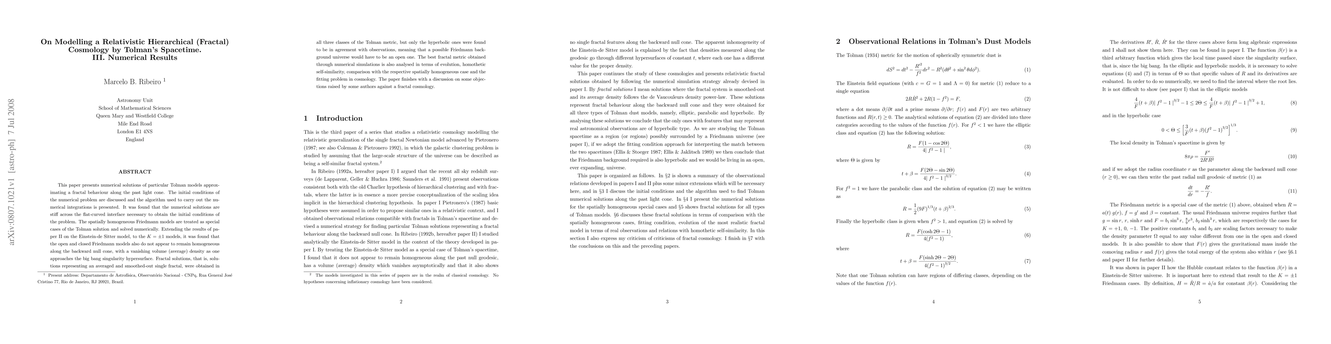 This paper presents numerical solutions of particular Lemaitre-Tolman models approximating a fractal behaviour along the past light cone, as discussed in paper I (0807.0866) of this series. The initial conditions of the numerical problem are discussed and the algorithm used to carry out the numerical integrations is presented. It was found that the numerical solutions are stiff across the flat-curved interface necessary to obtain the initial conditions of the problem. The spatially homogeneous Friedmann models are treated as special cases of the Lemaitre-Tolman solution and solved numerically. Extending the results of paper II (0807.0869) on the Einstein-de Sitter model, to the $K = \pm 1$ models, it was found that the open and closed Friedmann models also do not appear to remain homogeneous along the backward null cone, with a vanishing volume (average) density as one approaches the Big Bang singularity hypersurface. Fractal solutions, that is, solutions representing an averaged and smoothed-out single fractal, were obtained in all three classes of the Lemaitre-Tolman metric, but only the hyperbolic ones were found to be in agreement with observations, meaning that a possible Friedmann background universe would have to be an open one. The best fractal metric obtained through numerical simulations is also analysed in terms of evolution, homothetic self-similarity, comparison with the respective spatially homogeneous case and the fitting problem in cosmology. The paper finishes with a discussion on some objections raised by some authors against a fractal cosmology.