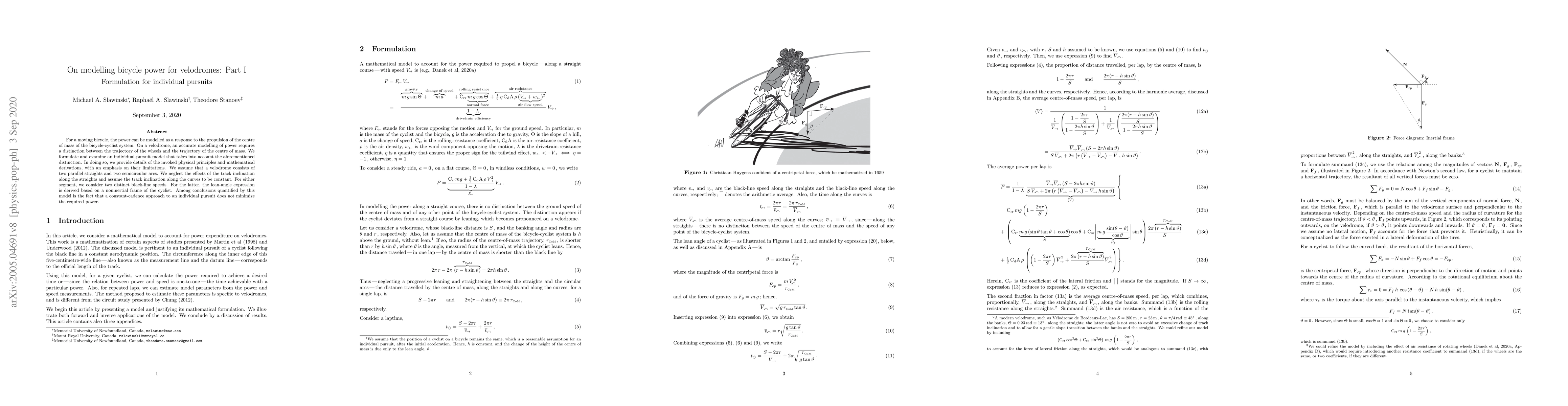 For a moving bicycle, the power can be modelled as a response to the propulsion of the centre of mass of the bicycle-cyclist system. On a velodrome, an accurate modelling of power requires a distinction between the trajectory of the wheels and the trajectory of the centre of mass. We formulate and examine an individual-pursuit model that takes into account the aforementioned distinction. In doing so, we provide details of the invoked physical principles and mathematical derivations, with an emphasis on their limitations. We assume that a velodrome consists of two parallel straights and two semicircular arcs. We neglect the effects of the track inclination along the straights and assume the track inclination along the curves to be constant. For either segment, we consider two distinct black-line speeds. For the latter, the lean-angle expression is derived based on a noninertial frame of the cyclist. Among conclusions quantified by this model is the fact that a constant-cadence approach to an individual pursuit does not minimize the required power.