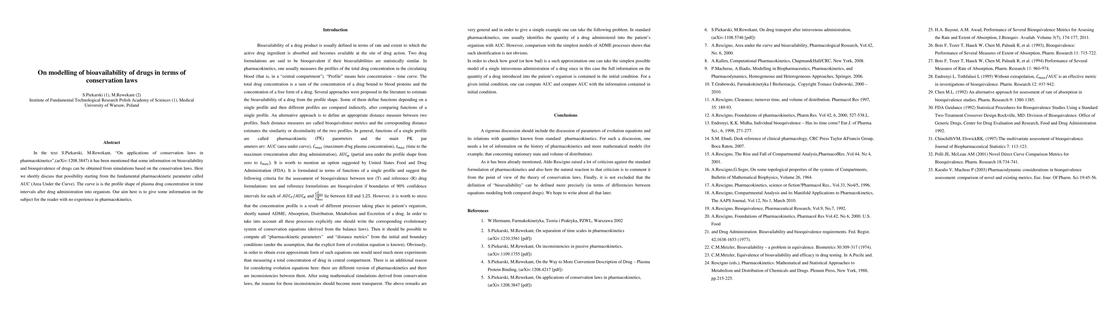In the text S.Piekarski, M.Rewekant,(arXiv:1208.3847)it has been mentioned that some information on bioavailability and bioequivalence of drugs can be obtained from simulations based on the conservation laws. Here we shortly discuss that possibility starting from the fundamental pharmacokinetic parameter called AUC (Area Under the Curve). The curve is is the profile shape of plasma drug concentration in time intervals after drug administration into organism. Our aim here is to give some information on the subject for the reader with no experience in pharmacokinetics.
