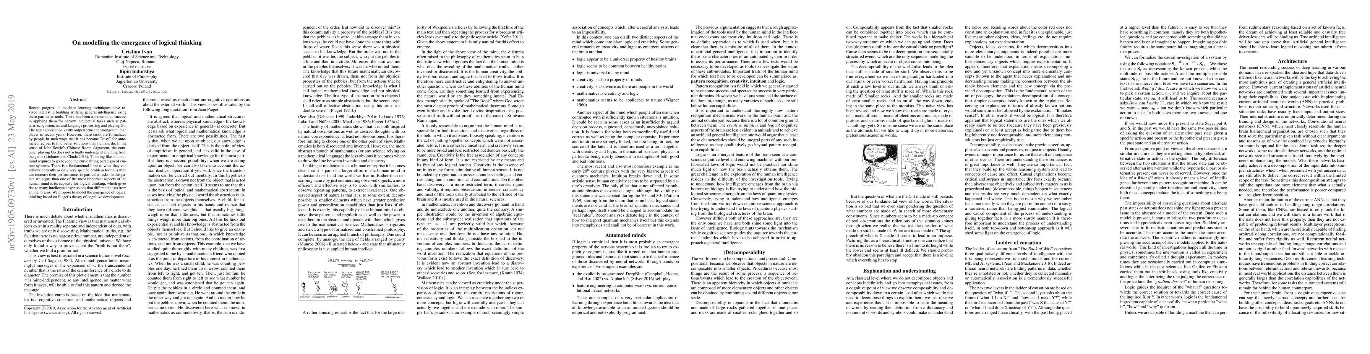 Recent progress in machine learning techniques have revived interest in building artificial general intelligence using these particular tools. There has been a tremendous success in applying them for narrow intellectual tasks such as pattern recognition, natural language processing and playing Go. The latter application vastly outperforms the strongest human player in recent years. However, these tasks are formalized by people in such ways that it has become "easy" for automated recipes to find better solutions than humans do. In the sense of John Searle's Chinese Room Argument, the computer playing Go does not actually understand anything from the game. Thinking like a human mind requires to go beyond the curve fitting paradigm of current systems. There is a fundamental limit to what they can achieve currently as only very specific problem formalization can increase their performances in particular tasks. In this paper, we argue than one of the most important aspects of the human mind is its capacity for logical thinking, which gives rise to many intellectual expressions that differentiate us from animal brains. We propose to model the emergence of logical thinking based on Piaget's theory of cognitive development.