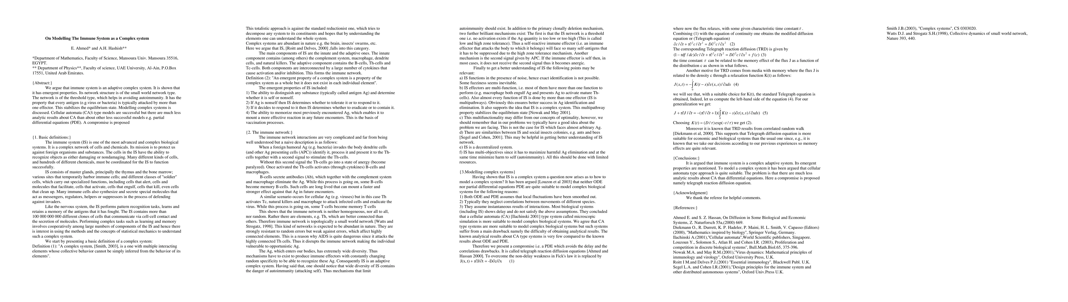 The immune system is modeled as a complex adaptive system with emergent properties, exhibiting characteristics of small world networks to avoid autoimmunity. A compromise approach is proposed to model such systems using cellular automata.