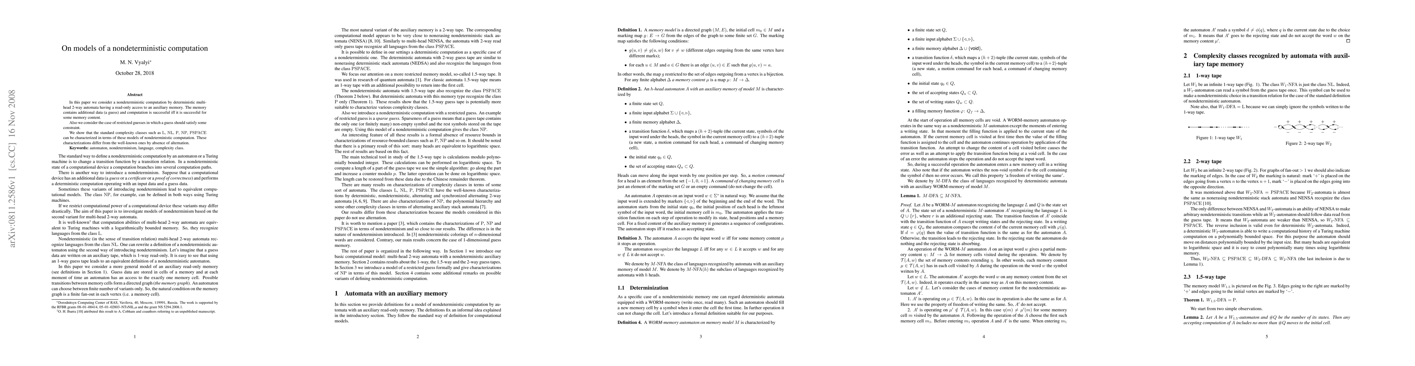 In this paper we consider a nondeterministic computation by deterministic multi-head 2-way automata having a read-only access to an auxiliary memory. The memory contains additional data (a guess) and computation is successful iff it is successful for some memory content. Also we consider the case of restricted guesses in which a guess should satisfy some constraint. We show that the standard complexity classes such as L, NL, P, NP, PSPACE can be characterized in terms of these models of nondeterministic computation. These characterizations differ from the well-known ones by absence of alternation.