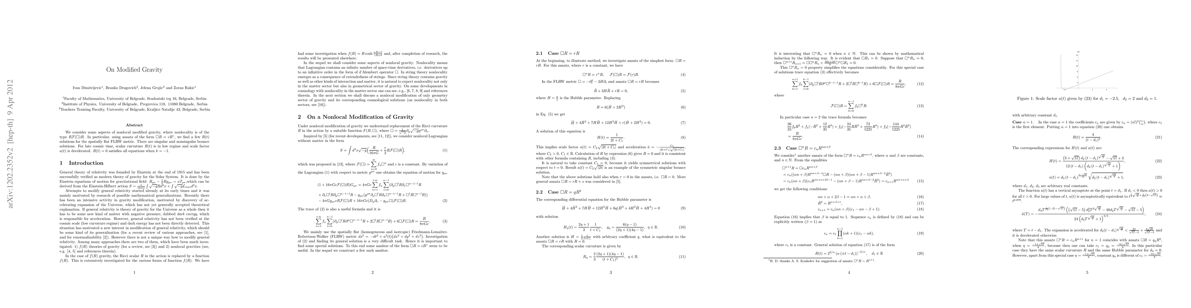 We consider some aspects of nonlocal modified gravity, where nonlocality is of the type $R \mathcal{F}(\Box) R$. In particular, using ansatz of the form $\Box R = c R^\gamma,$ we find a few $R(t)$ solutions for the spatially flat FLRW metric. There are singular and nonsingular bounce solutions. For late cosmic time, scalar curvature R(t) is in low regime and scale factor a(t) is decelerated. R (t) = 0 satisfies all equations when k = -1.