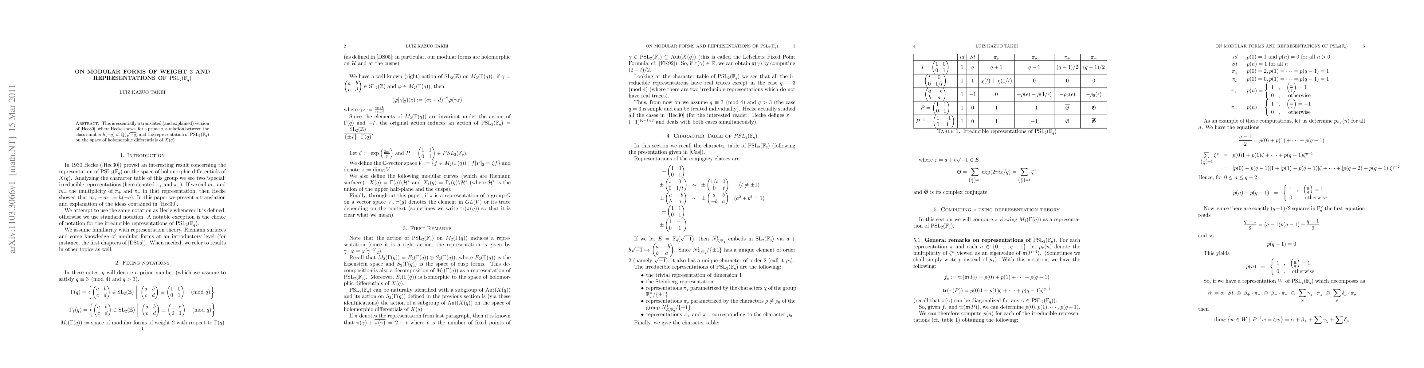 This is essentially a translated (and explained) version of a peper Hecke published in 1930 where he shows, for a prime q, a relation between the class number h(-q) and the representation of PSL(2, Z / pZ) on the space of holomorphic differentials of X(q).