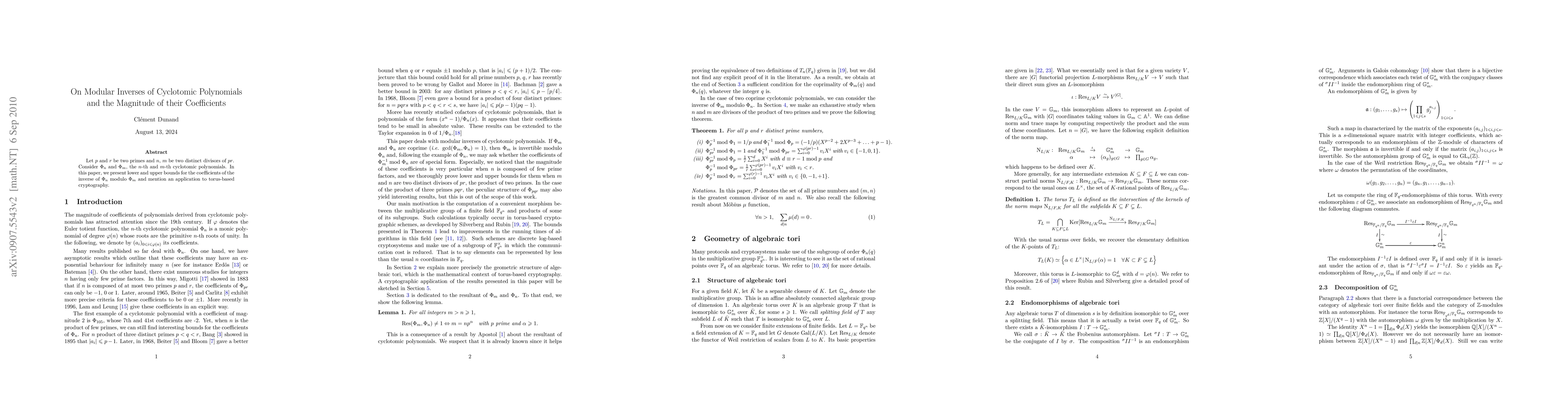This paper investigates the modular inverses of cyclotomic polynomials associated with distinct divisors of a product of two primes, establishing bounds for their coefficients. An application to torus-based cryptographic systems is also discussed.