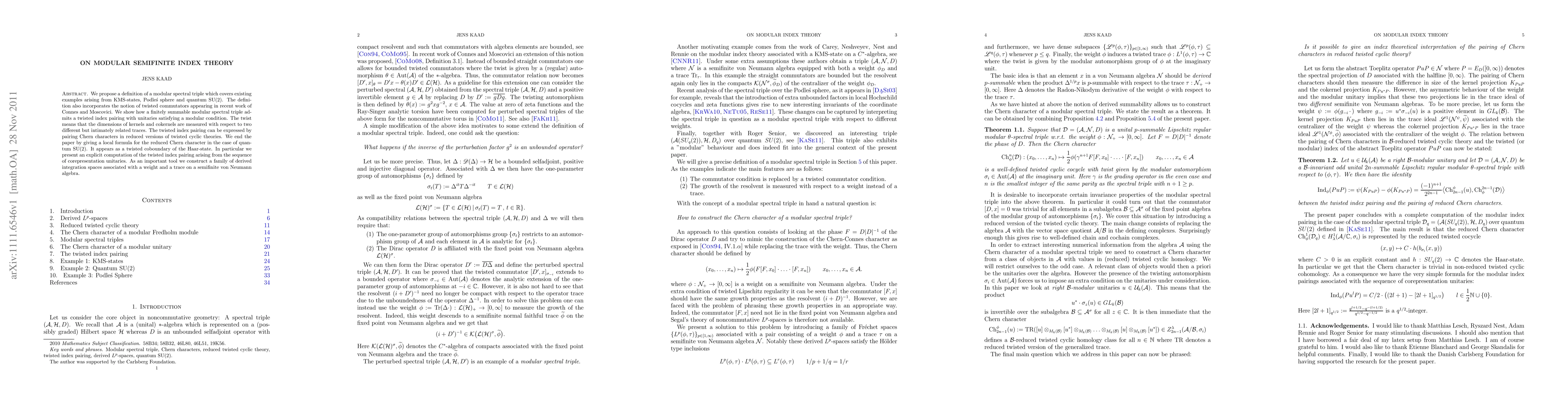 This paper introduces a modular spectral triple definition encompassing various examples and twisted commutators, demonstrating a twisted index pairing for finitely summable triples. It provides a local formula for the reduced Chern character in the context of quantum SU(2) and constructs derived integration spaces for semifinite von Neumann algebras.