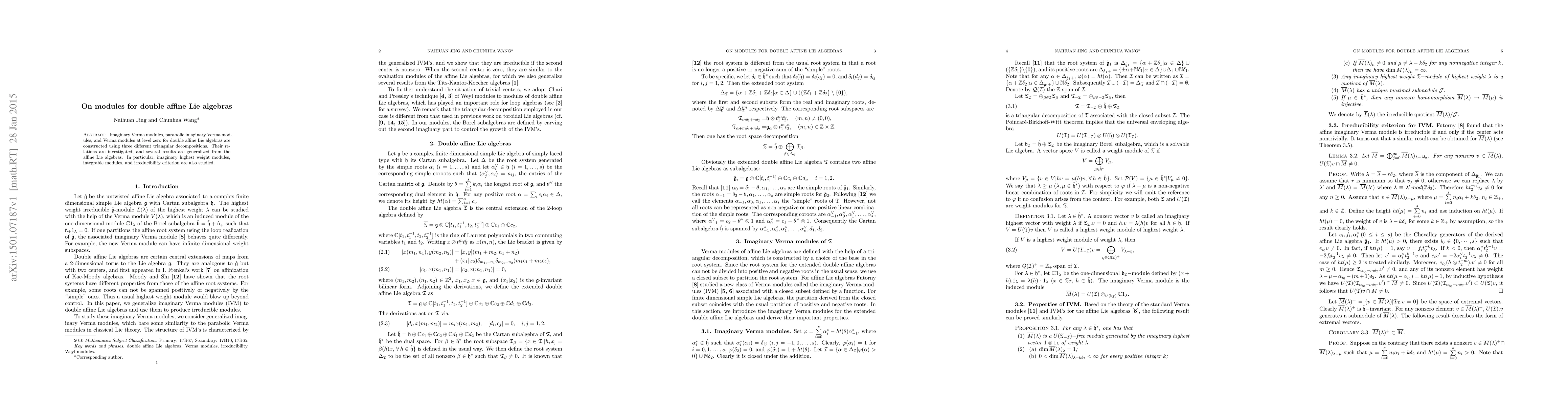 This paper constructs various modules for double affine Lie algebras using different triangular decompositions, explores their relations, and generalizes several results from affine Lie algebras, including studies on imaginary highest weight modules, integrable modules, and irreducibility criteria.
