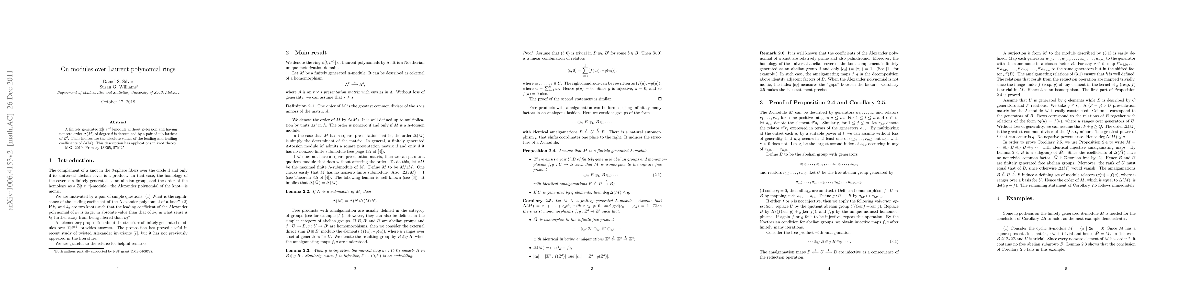 A finitely generated module over the ring L=Z[t, t^{-1}] of integer Laurent polynomials that has no Z-torsion is determined by a pair of sub-lattices of L^d. Their indices are the absolute values of the leading and trailing coefficients of the order of the module. This description has applications in knot theory.