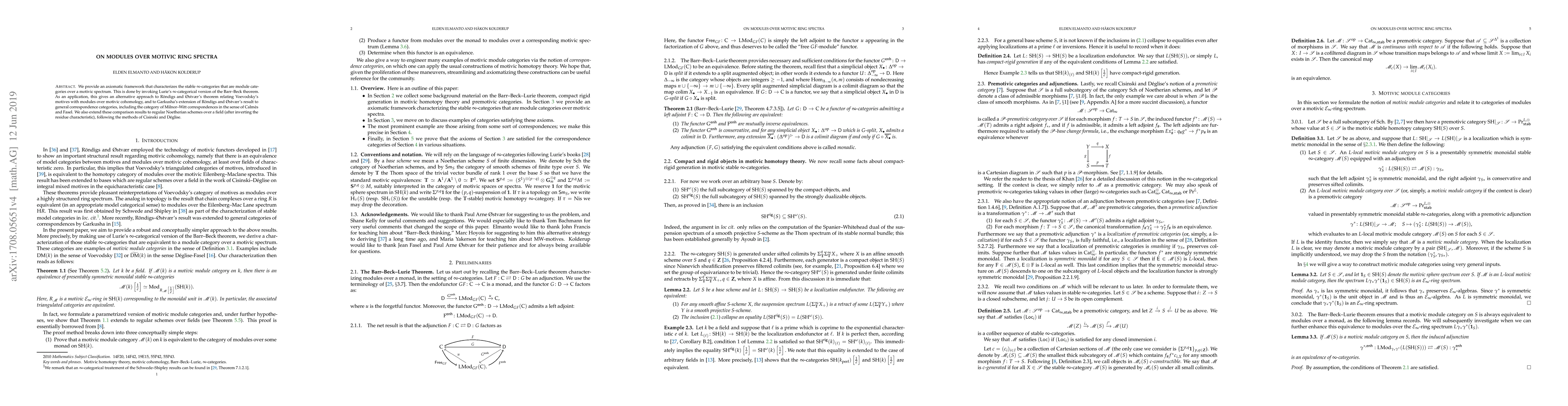In this note, we provide an axiomatic framework that characterizes the stable $\infty$-categories that are module categories over a motivic spectrum. This is done by invoking Lurie's $\infty$-categorical version of the Barr--Beck theorem. As an application, this gives an alternative approach to R\"ondigs and \O stv\ae r's theorem relating Voevodsky's motives with modules over motivic cohomology, and to Garkusha's extension of R\"ondigs and \O stv\ae r's result to general correspondence categories, including the category of Milnor-Witt correspondences in the sense of Calm\`es and Fasel. We also extend these comparison results to regular Noetherian schemes over a field (after inverting the residue characteristic), following the methods of Cisinski and D\'eglise.