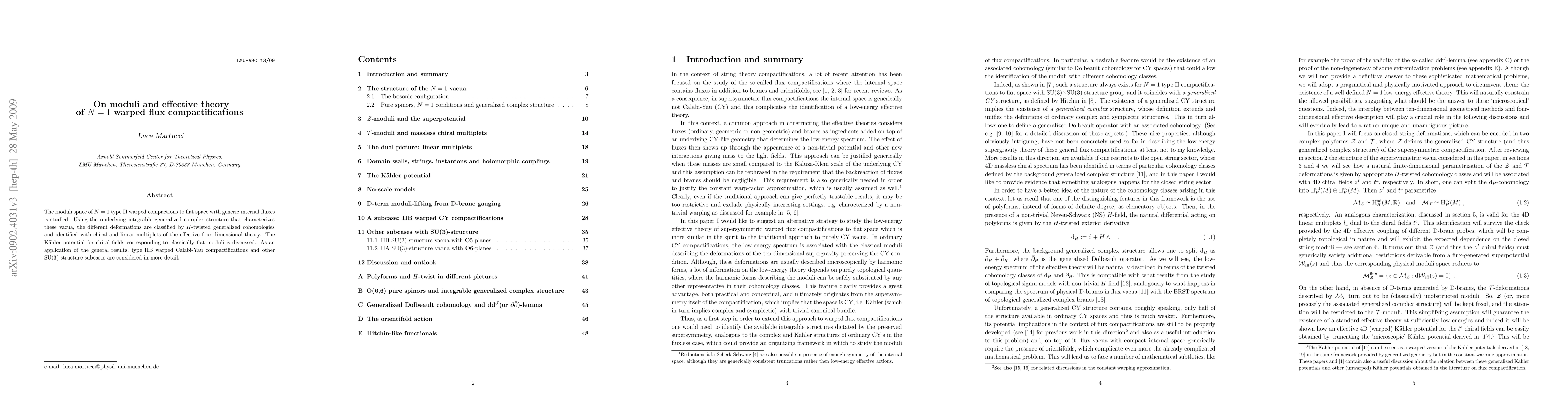 This paper studies the moduli space of N=1 type IIB warped compactifications, classifying deformations via H-twisted generalized cohomologies and linking them to effective four-dimensional chiral and linear multiplets. It also discusses the Kaehler potential for classically flat moduli and applies these findings to type IIB and other SU(3)-structure compactifications.