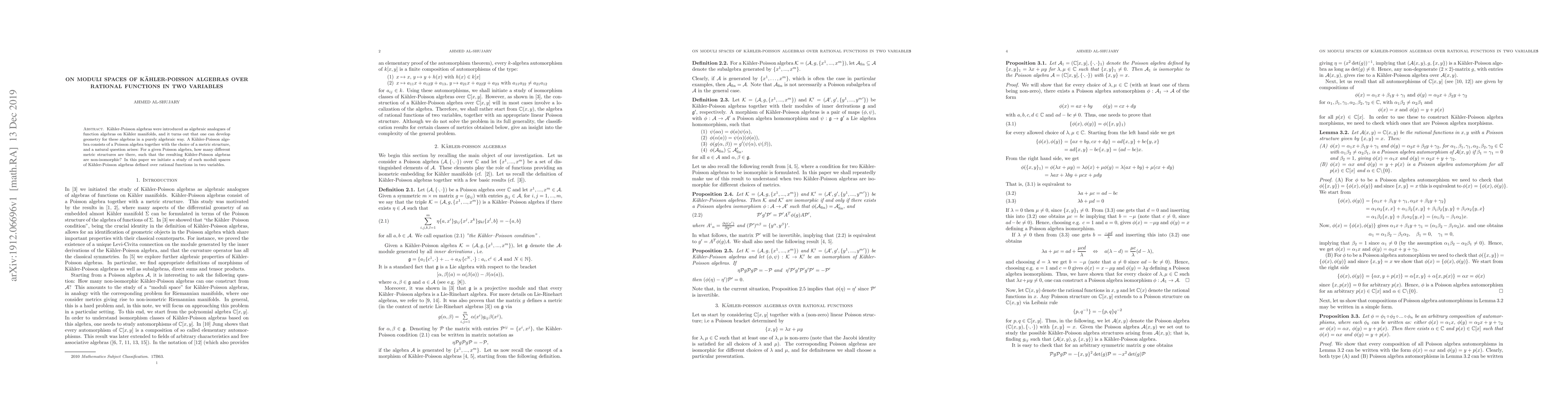 K\"ahler-Poisson algebras were introduced as algebraic analogues of function algebras on K\"ahler manifolds, and it turns out that one can develop geometry for these algebras in a purely algebraic way. A K\"ahler-Poisson algebra consists of a Poisson algebra together with the choice of a metric structure, and a natural question arises: For a given Poisson algebra, how many different metric structures are there, such that the resulting K\"ahler-Poisson algebras are non-isomorphic? In this paper we initiate a study of such moduli spaces of K\"ahler-Poisson algebras defined over rational functions in two variables.