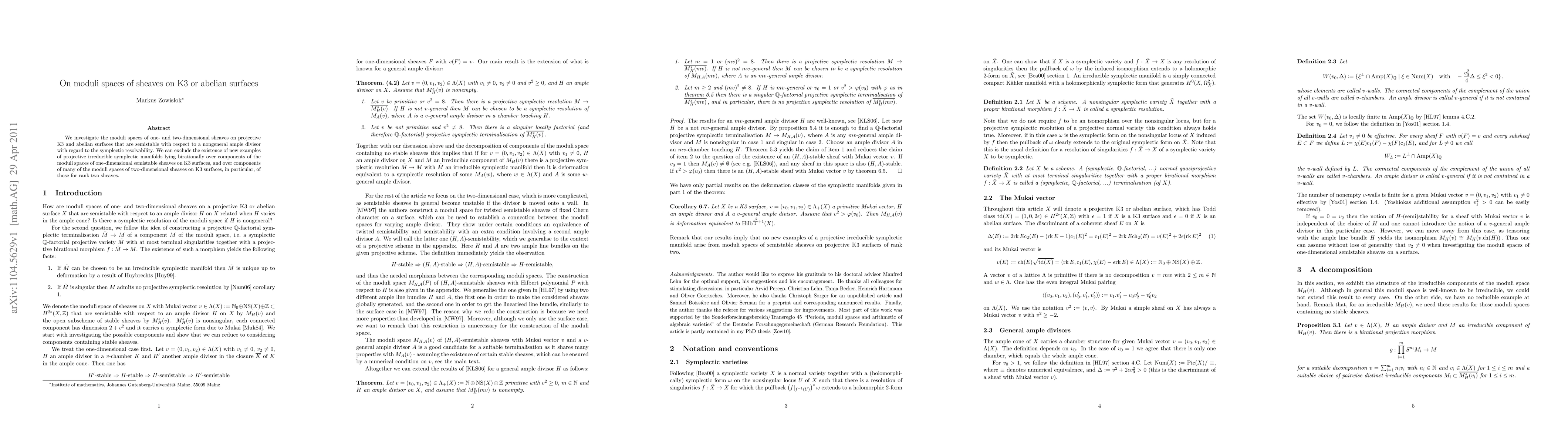 This paper studies moduli spaces of semistable sheaves on K3 and abelian surfaces, focusing on their symplectic resolvability, and concludes that no new projective irreducible symplectic manifolds arise from these moduli spaces, particularly for rank two sheaves.