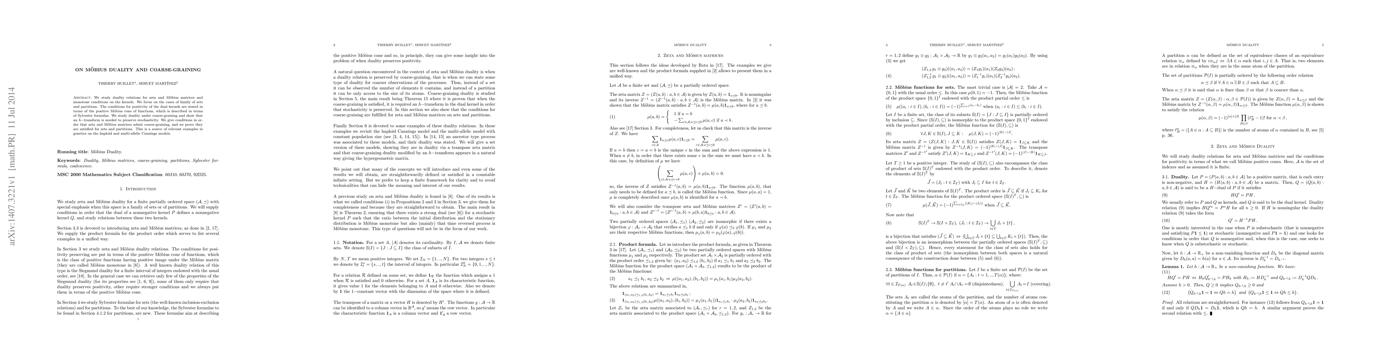 This research explores duality relations between zeta and Möbius matrices, focusing on monotone kernel conditions for families of sets and partitions. It introduces positive Möbius cone functions described via Sylvester formulae, and investigates duality under coarse-graining, requiring an $h$-transform to maintain stochasticity. The study establishes conditions for zeta and Möbius matrices' coarse-graining, verified for sets and partitions, with implications in genetics for Cannings models.