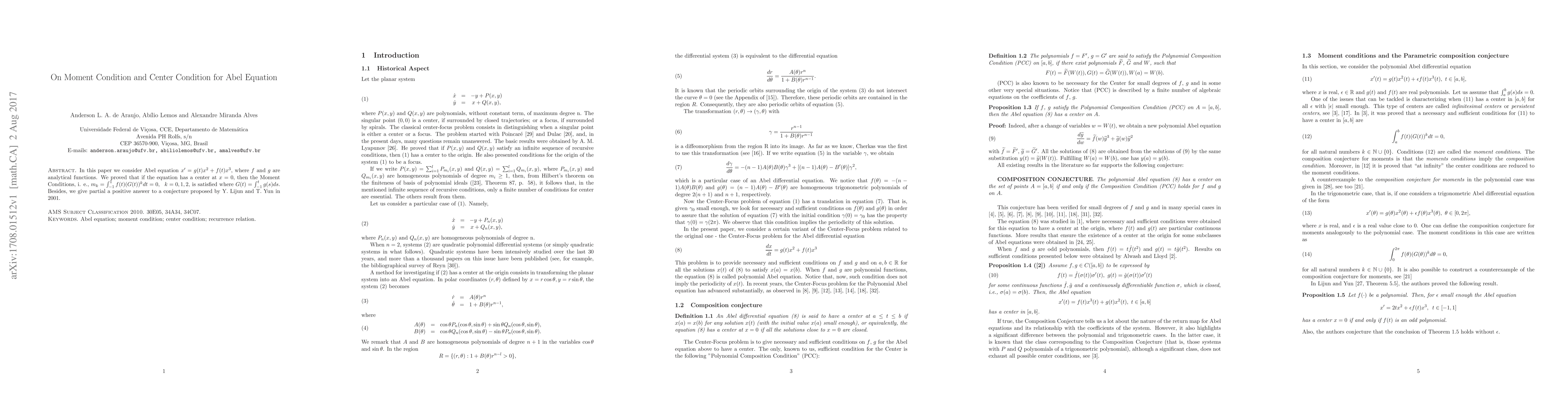 In this paper we consider Abel equation $x' = g(t)x^2+f(t)x^3$, where $f$ and $g$ are analytical functions. We proved that if the equation has a center at $x=0$, then the Moment Conditions, i. e., $m_k=\int_{-1}^1f(t)(G(t))^kdt=0,~~k=0,1,2$, is satisfied where $G(t)=\int_{-1}^tg(s)ds$. Besides, we give partial a positive answer to a conjecture proposed by Y. Lijun and T. Yun in 2001.