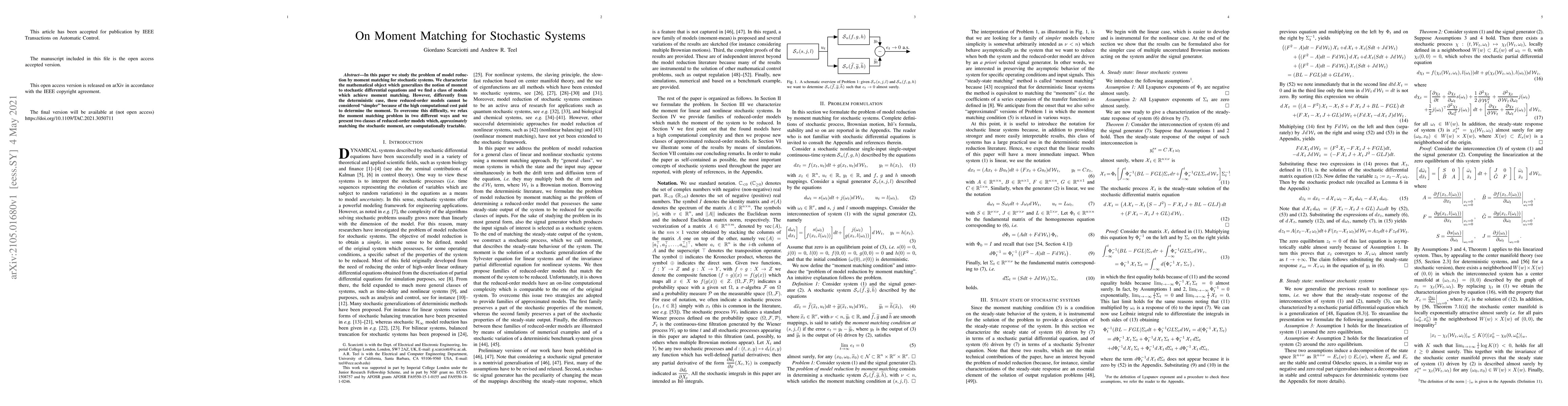 The paper studies model reduction by moment matching for stochastic systems, characterizing the moment through a generalized Sylvester equation for linear systems and a stochastic partial differential equation for nonlinear systems, then proposing families of reduced-order models.