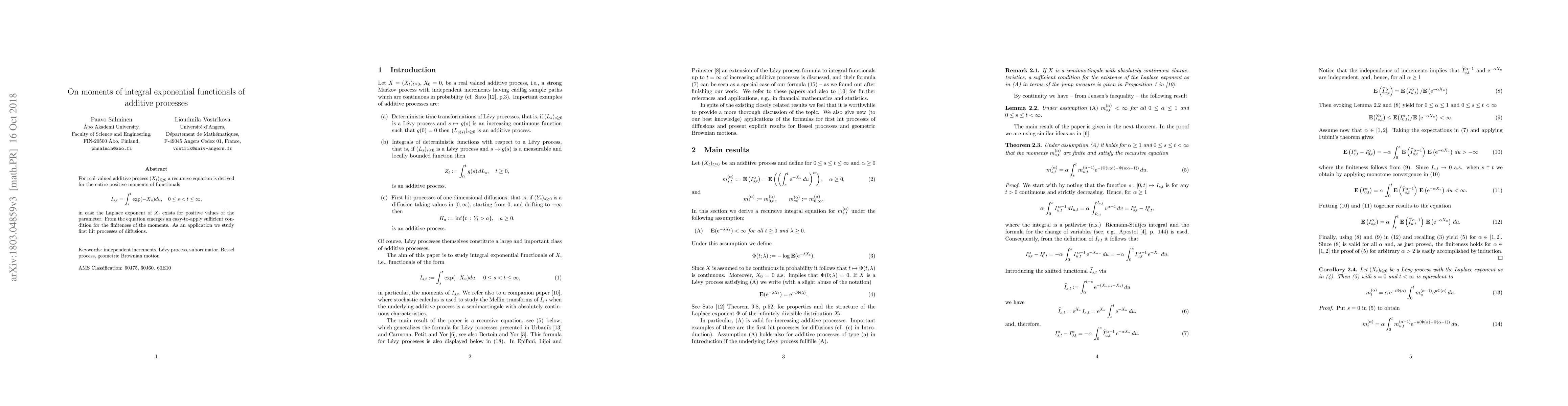 This paper derives a recursive formula for the positive moments of integral exponential functionals of additive processes, providing a sufficient condition for their finiteness. It applies the results to study first hit processes of diffusions.