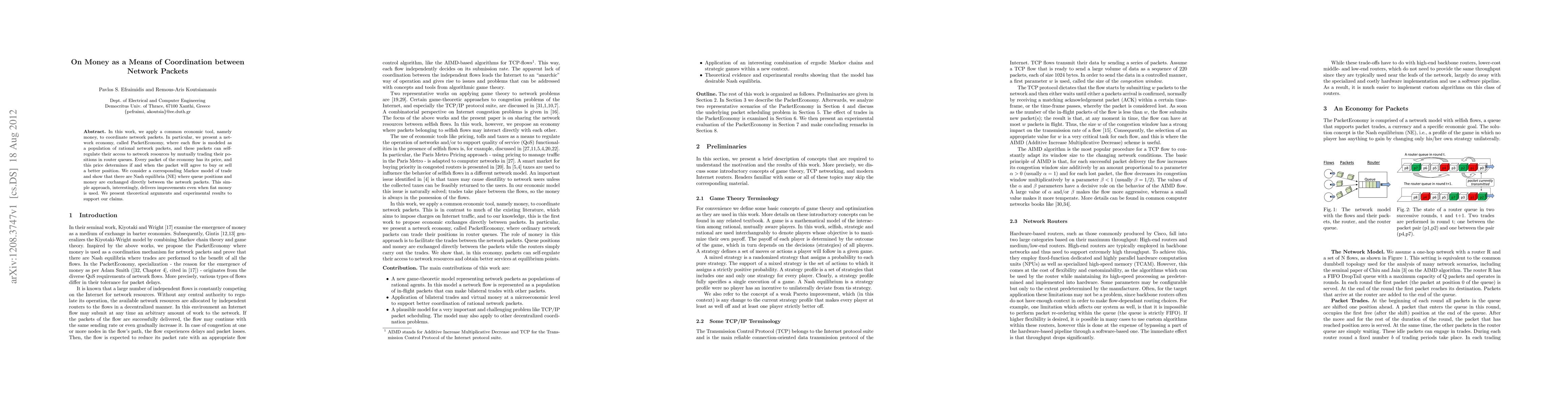In this work, we apply a common economic tool, namely money, to coordinate network packets. In particular, we present a network economy, called PacketEconomy, where each flow is modeled as a population of rational network packets, and these packets can self-regulate their access to network resources by mutually trading their positions in router queues. Every packet of the economy has its price, and this price determines if and when the packet will agree to buy or sell a better position. We consider a corresponding Markov model of trade and show that there are Nash equilibria (NE) where queue positions and money are exchanged directly between the network packets. This simple approach, interestingly, delivers improvements even when fiat money is used. We present theoretical arguments and experimental results to support our claims.