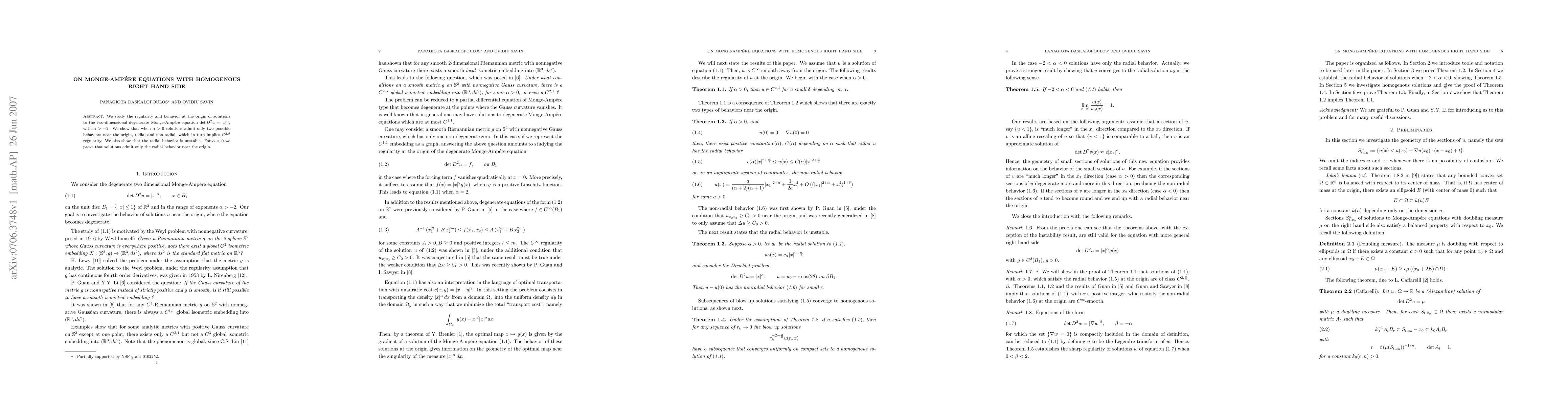 This paper investigates the regularity and origin behavior of solutions to a two-dimensional degenerate Monge-Ampere equation with a homogeneous right-hand side. It finds that for positive alpha, solutions exhibit either radial or non-radial behavior, with radial being unstable, while for negative alpha, only radial behavior occurs.