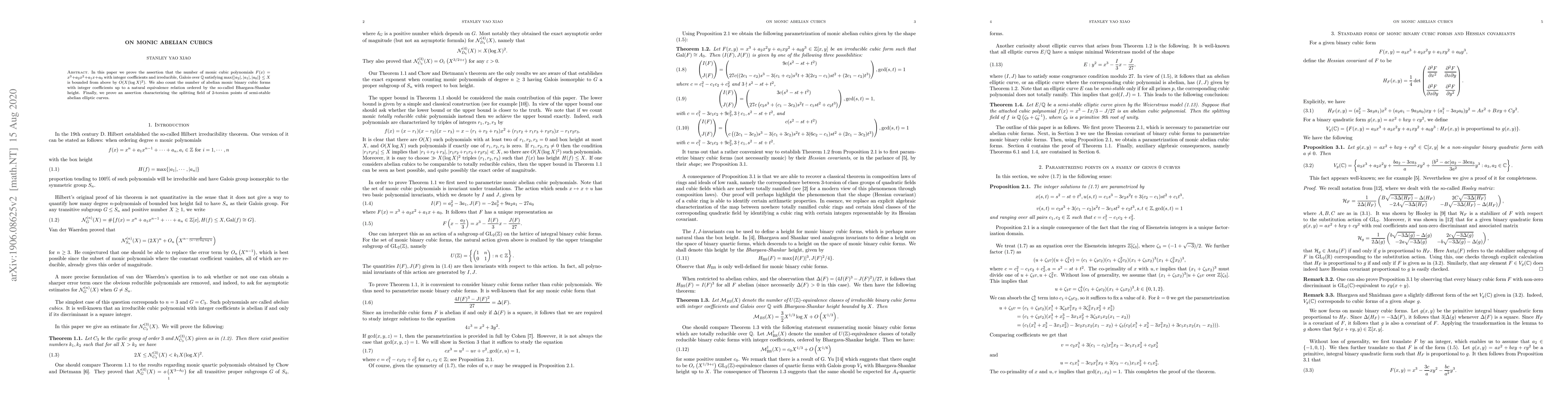 In this paper we prove the assertion that the number of monic cubic polynomials $F(x) = x^3 + a_2 x^2 + a_1 x + a_0$ with integer coefficients and irreducible, Galois over $\mathbb{Q}$ satisfying $\max\{|a_2|, |a_1|, |a_0|\} \leq X$ is bounded from above by $O(X (\log X)^2)$. We also count the number of abelian monic binary cubic forms with integer coefficients up to a natural equivalence relation ordered by the so-called Bhargava-Shankar height. Finally, we prove an assertion characterizing the splitting field of 2-torsion points of semi-stable abelian elliptic curves