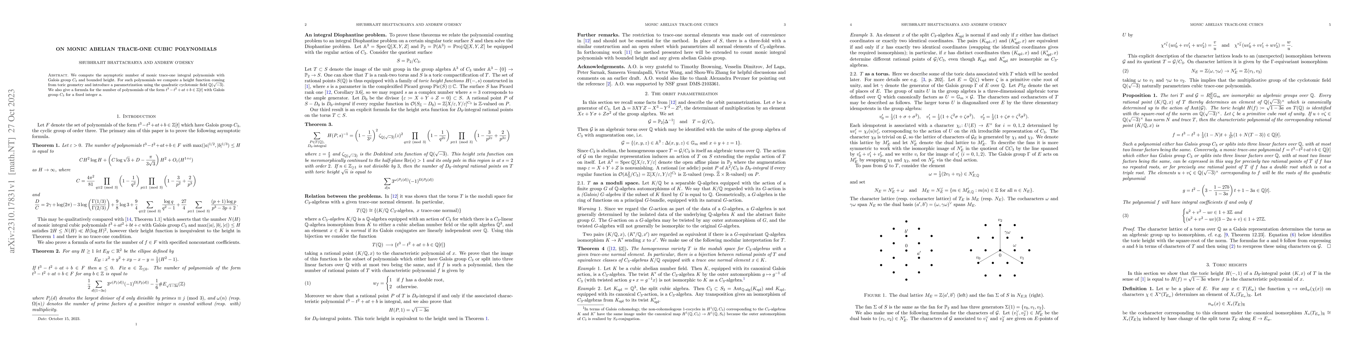 This paper calculates the asymptotic number of monic trace-one integral cubic polynomials with Galois group $C_3$ and bounded height, introducing a height function from toric geometry and a parametrization using $\mathbb Q(\sqrt{-3})$. It also provides a formula for the count of such polynomials of the form $t^3 - t^2 + at + b \in \mathbb Z[t]$ with $C_3$ Galois group for a fixed integer $a$.