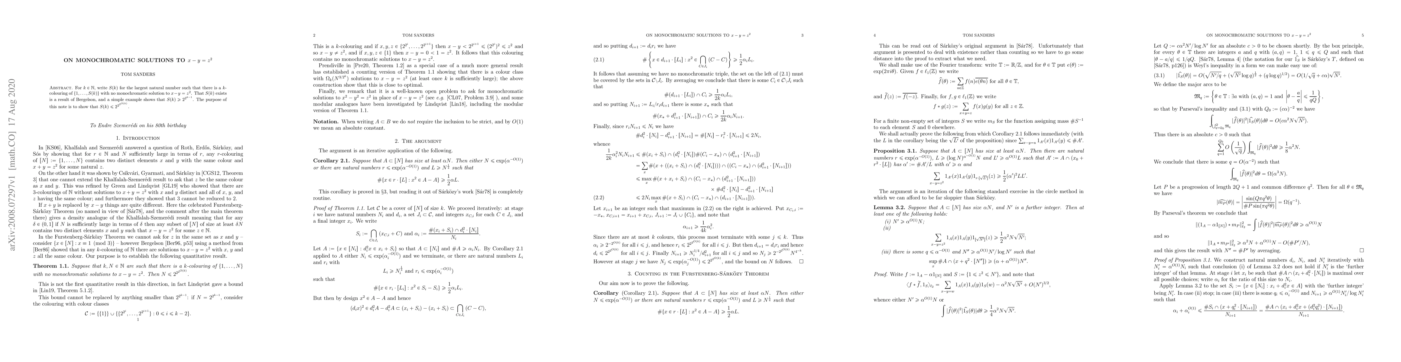 This paper investigates the largest natural number $S(k)$ for which there exists a $k$-colouring of $\{1,\dots,S(k)\}$ without a monochromatic solution to $x-y=z^2$. It proves that $S(k)\leq 2^{2^{2^{O(k)}}}$, improving on previous bounds.