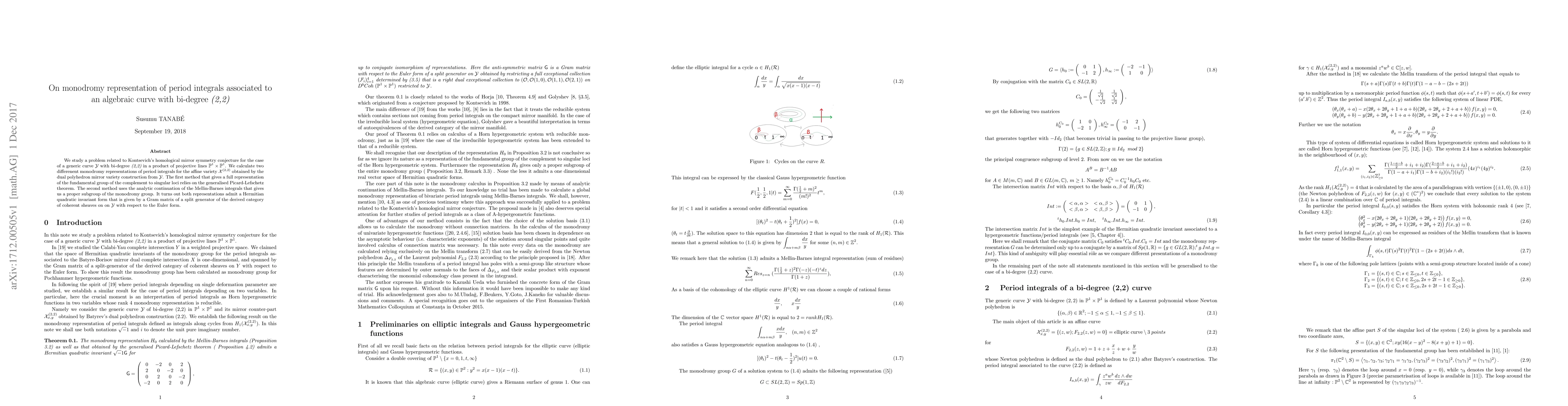 We study a problem related to Kontsevich's homological mirror symmetry conjecture for the case of a generic curve $\cal Y$ with bi-degree (2,2) in a product of projective lines ${\Bbb P}^{1} \times {\Bbb P}^{1}$. We calculate two differenent monodromy representations of period integrals for the affine variety ${\cal X}^{(2,2)}$ obtained by the dual polyhedron mirror variety construction from $\cal Y$. The first method that gives a full representation of the fundamental group of the complement to singular loci relies on the generalised Picard-Lefschetz theorem. The second method uses the analytic continuation of the Mellin-Barnes integrals that gives us a proper subgroup of the monodromy group. It turns out both representations admit a Hermitian quadratic invariant form that is given by a Gram matrix of a split generator of the derived category of coherent sheaves on on $\cal Y$ with respect to the Euler form.