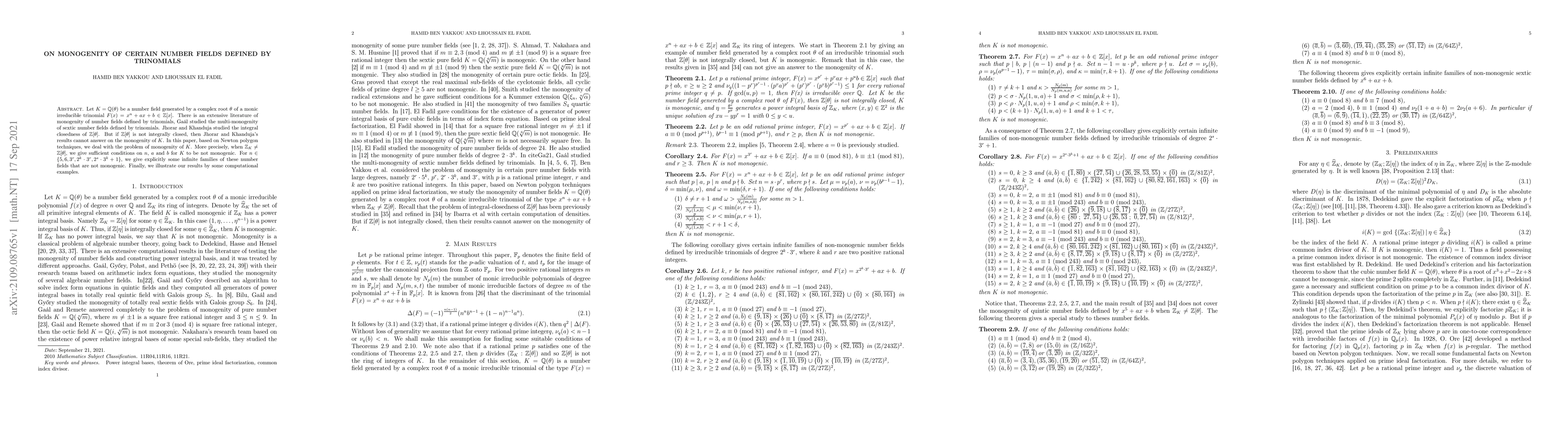 This paper investigates the monogenity of number fields $K = \Q(\theta)$ defined by trinomials $\theta$ being roots of $F(x) = x^n + ax + b \in \Z[x]$. Using Newton polygon techniques, it provides conditions for $K$ to be non-monogenic when $\Z_K \neq \Z[\theta]$, specifically identifying infinite families for certain values of $n$.