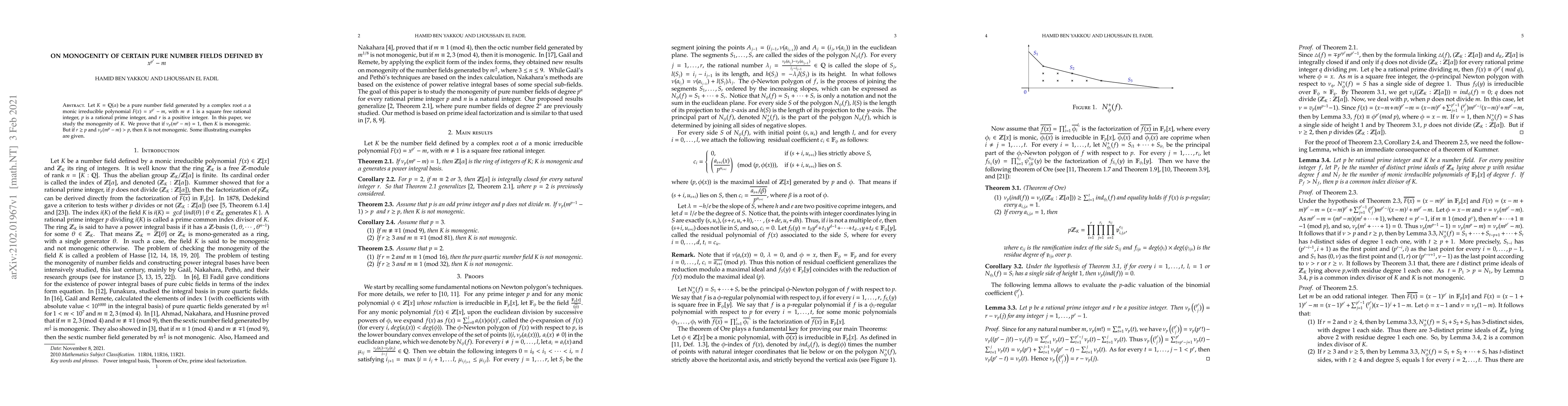This paper investigates the monogenity of pure number fields $K = \mathbb{Q} (\alpha)$ generated by roots of the polynomial $F(x) = x^{p^r} - m$, where $m$ is a square-free integer and $p$ is a prime. It proves that $K$ is monogenic if $\nu_p(m^p-m)=1$ but not if $r\ge p$ and $\nu_p(m^p-m)> p$.