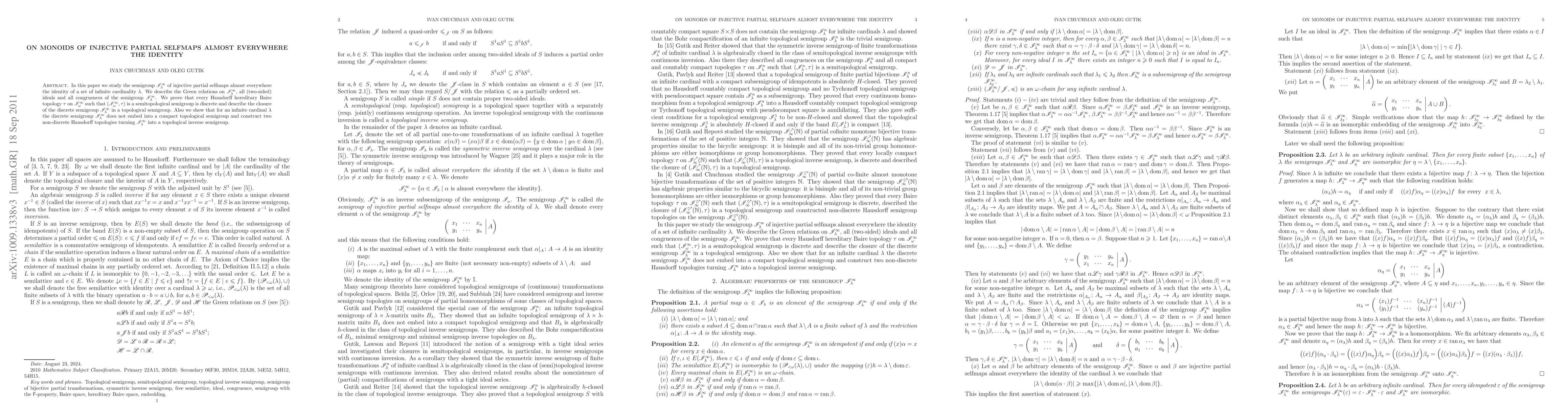 This paper investigates the semigroup $\mathscr{I}^{\infty}_\lambda$ of injective partial selfmaps that are almost everywhere the identity on a set of infinite cardinality $\lambda$. It describes the Green relations, ideals, and congruences of this semigroup and proves that any Hausdorff Baire topology on $\mathscr{I}^{\infty}_\omega$ making it a semitopological semigroup is discrete.