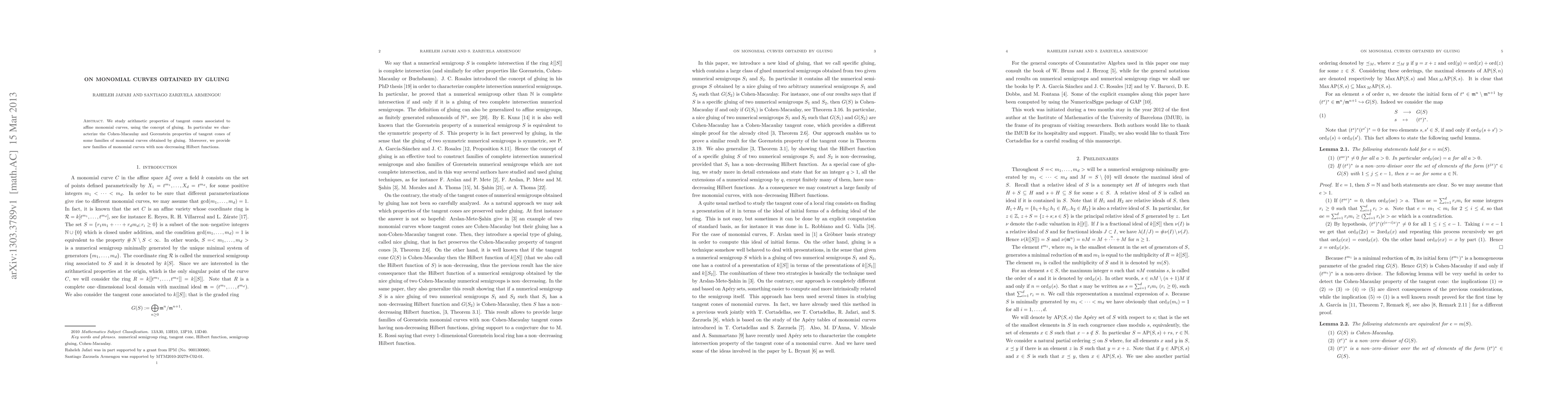 This paper investigates the arithmetic properties of tangent cones for affine monomial curves formed by gluing, focusing on their Cohen-Macaulay and Gorenstein characteristics. It also introduces new families of monomial curves with non-decreasing Hilbert functions.