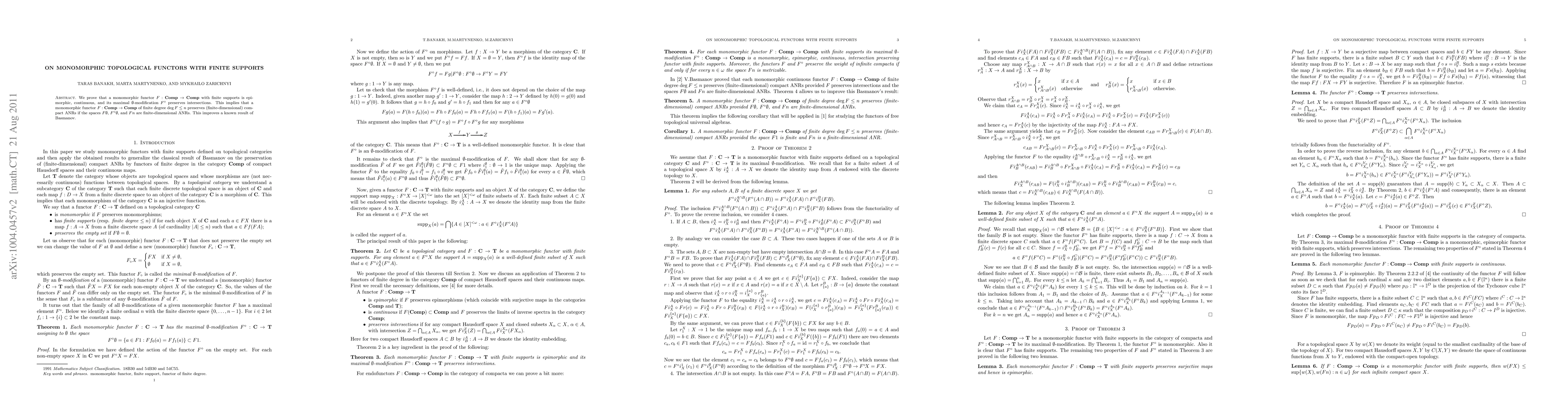 We prove that a monomorphic functor $F:Comp\to Comp$ with finite supports is epimorphic, continuous, and its maximal $\emptyset$-modification $F^\circ$ preserves intersections. This implies that a monomorphic functor $F:Comp\to Comp$ of finite degree $deg F\le n$ preserves (finite-dimensional) compact ANR's if the spaces $F\emptyset$, $F^\circ\emptyset$, and $Fn$ are finite-dimensional ANR's. This improves a known result of Basmanov.