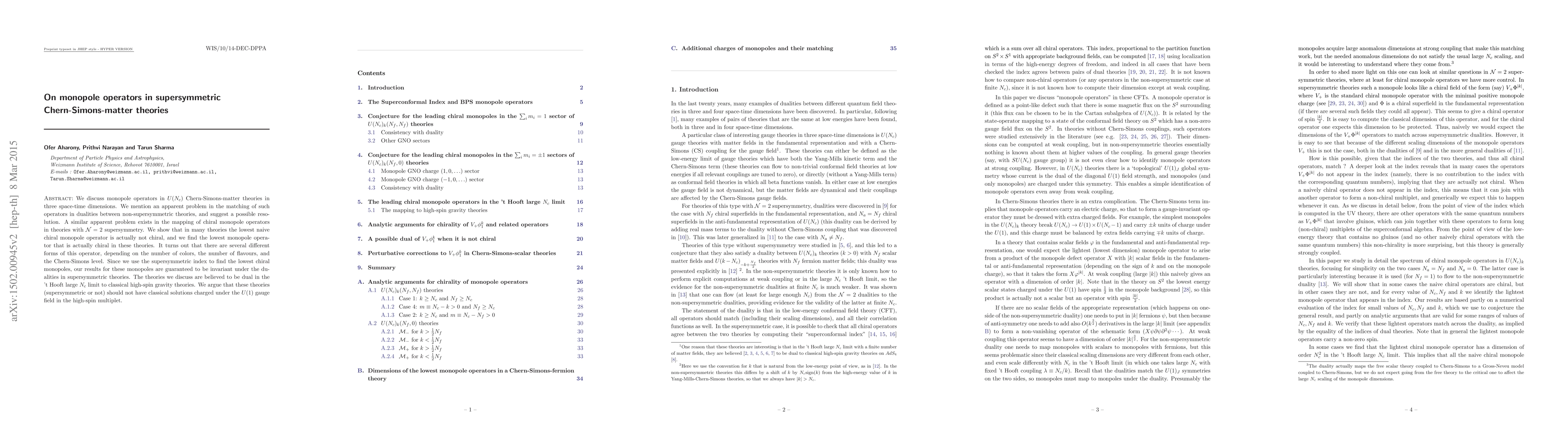 We discuss monopole operators in $U(N_c)$ Chern-Simons-matter theories in three space-time dimensions. We mention an apparent problem in the matching of such operators in dualities between non-supersymmetric theories, and suggest a possible resolution. A similar apparent problem exists in the mapping of chiral monopole operators in theories with ${\cal N}=2$ supersymmetry. We show that in many theories the lowest naive chiral monopole operator is actually not chiral, and we find the lowest monopole operator that is actually chiral in these theories. It turns out that there are several different forms of this operator, depending on the number of colors, the number of flavours, and the Chern-Simons level. Since we use the supersymmetric index to find the lowest chiral monopoles, our results for these monopoles are guaranteed to be invariant under the dualities in supersymmetric theories. The theories we discuss are believed to be dual in the 't~Hooft large $N_c$ limit to classical high-spin gravity theories. We argue that these theories (supersymmetric or not) should not have classical solutions charged under the $U(1)$ gauge field in the high-spin multiplet.