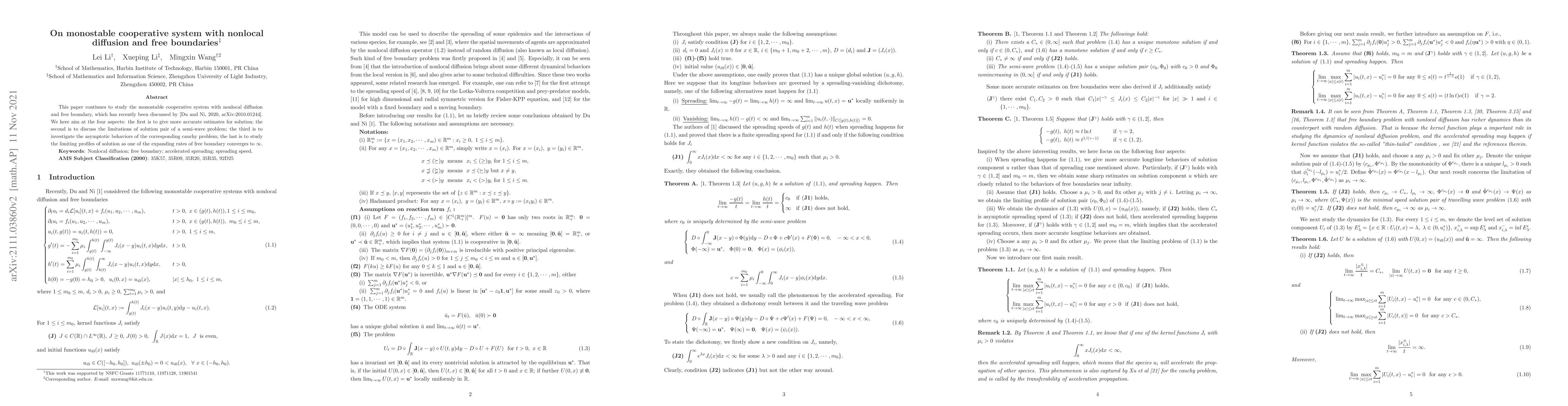 This paper continues to study the monostable cooperative system with nonlocal diffusion and free boundary, which has recently been discussed by [Du and Ni, 2020, arXiv:2010.01244]. We here aim at the four aspects: the first is to give more accurate estimates for solution; the second is to discuss the limitations of solution pair of a semi-wave problem; the third is to investigate the asymptotic behaviors of the corresponding cauchy problem; the last is to study the limiting profiles of solution as one of the expanding rates of free boundary converges to $\yy$. Then two epidemic models are given to illustrate their own longtime behaviors.