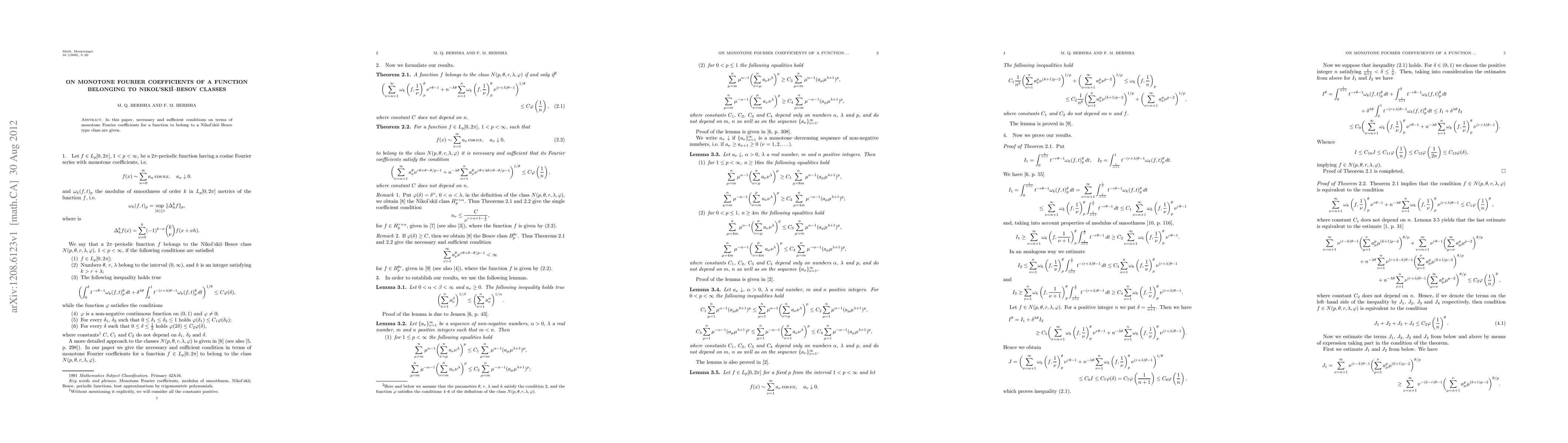 In this paper, necessary and sufficient conditions on terms of monotone Fourier coefficients for a function to belong to a Nikol'ski\u{\i}--Besov type class are given.