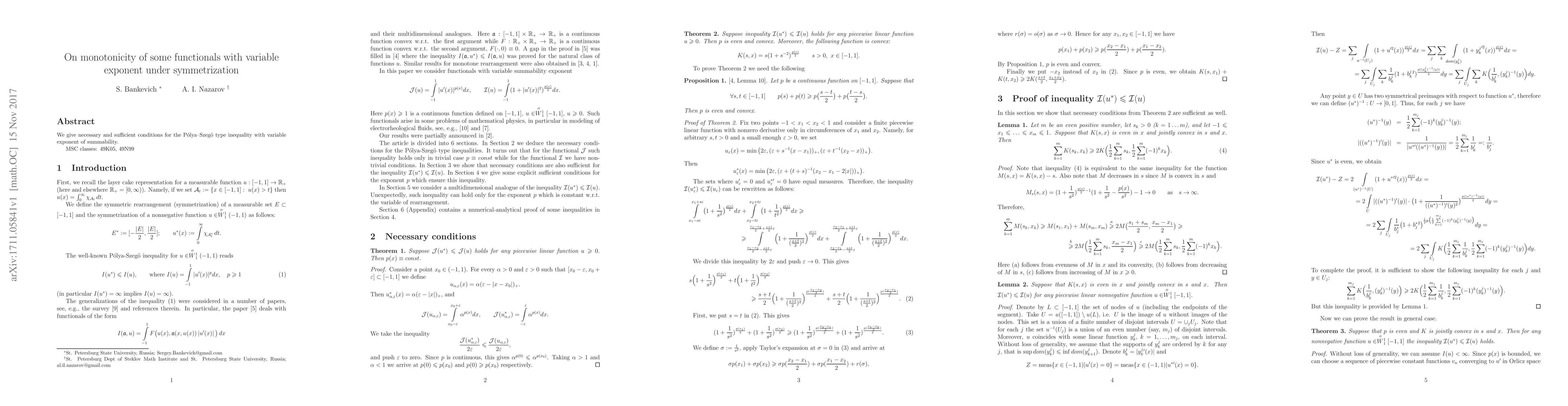 We give necessary and sufficient conditions for the P\'olya--Szeg\"o type inequality with variable exponent of summability.