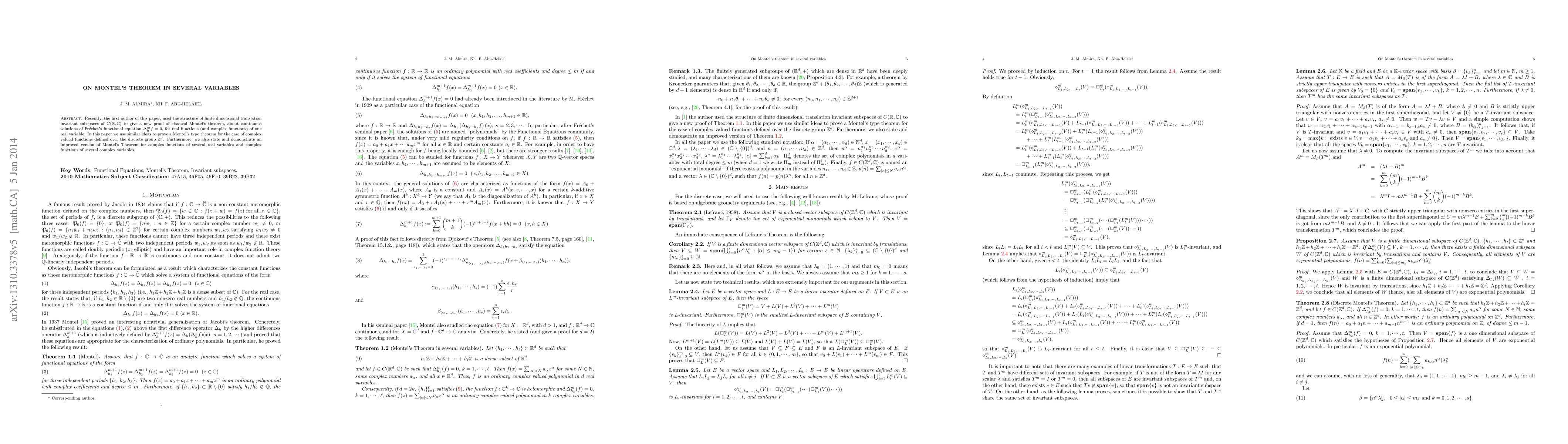 Recently, the first author of this paper, used the structure of finite dimensional translation invariant subspaces of C(R,C) to give a new proof of classical Montel's theorem, about continuous solutions of Fr\'{e}chet's functional equation $\Delta_h^mf=0$, for real functions (and complex functions) of one real variable. In this paper we use similar ideas to prove a Montel's type theorem for the case of complex valued functions defined over the discrete group Z^d. Furthermore, we also state and demonstrate an improved version of Montel's Theorem for complex functions of several real variables and complex functions of several complex variables.