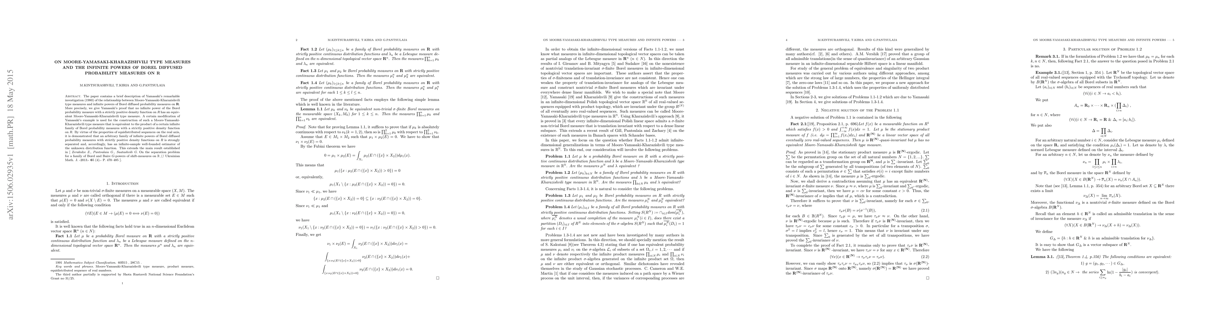The paper contains a brief description of Yamasaki's remarkable investigation (1980) of the relationship between Moore-Yamasaki-Kharazishvili type measures and infinite powers of Borel diffused probability measures on ${\bf R}$. More precisely, we give Yamasaki's proof that no infinite power of the Borel probability measure with a strictly positive density function on $R$ has an equivalent Moore-Yamasaki-Kharazishvili type measure. A certain modification of Yamasaki's example is used for the construction of such a Moore-Yamasaki-Kharazishvili type measure that is equivalent to the product of a certain infinite family of Borel probability measures with a strictly positive density function on $R$. By virtue of the properties of equidistributed sequences on the real axis, it is demonstrated that an arbitrary family of infinite powers of Borel diffused probability measures with strictly positive density functions on $R$ is strongly separated and, accordingly, has an infinite-sample well-founded estimator of the unknown distribution function. This extends the main result established in [ Zerakidze Z., Pantsulaia G., Saatashvili G. On the separation problem for a family of Borel and Baire $G$-powers of shift-measures on $\mathbb{R}$ // Ukrainian Math. J. -2013.-65 (4).- P. 470--485 ].