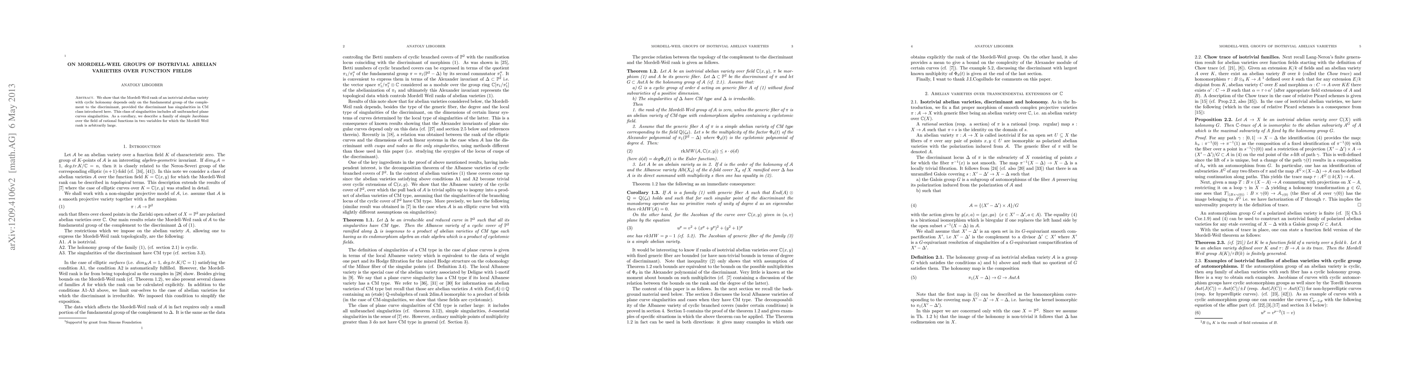 Summary: The paper demonstrates that the Mordell-Weil rank of isotrivial abelian varieties with cyclic holonomy hinges on the fundamental group of the discriminant's complement, especially when singularities are present in a specific CM class, leading to large Mordell-Weil ranks for Jacobians of certain rational function fields.
