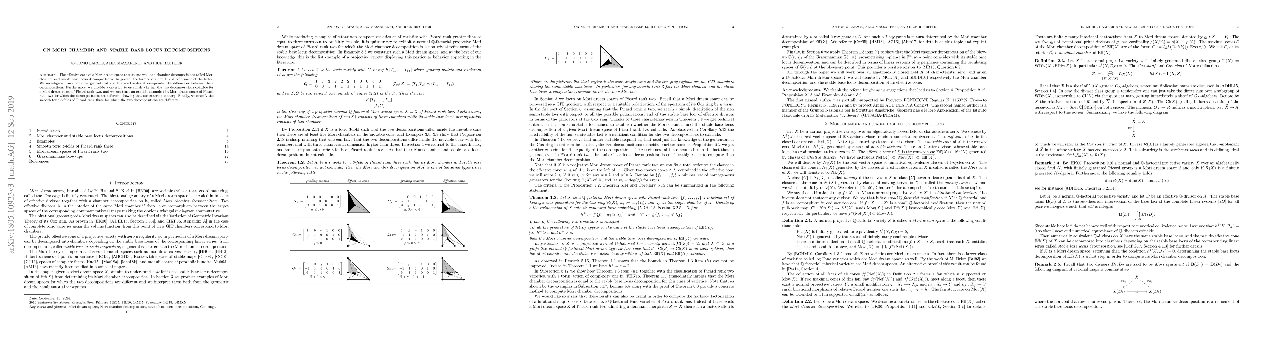 This paper explores the differences between Mori chamber and stable base locus decompositions in Mori dream spaces, providing a criterion for when they coincide in spaces of Picard rank two and constructing an example where they differ. It also classifies smooth toric 3-folds of Picard rank three with distinct decompositions.