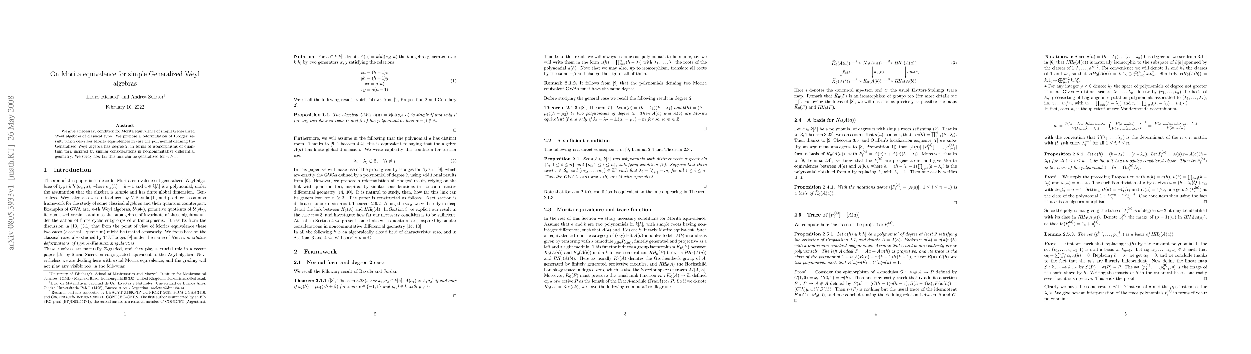 This paper establishes a necessary condition for Morita equivalence of simple Generalized Weyl algebras and reformulates Hodges' result on degree 2 polynomials in terms of isomorphisms of quantum tori, exploring the potential generalization for higher degrees.