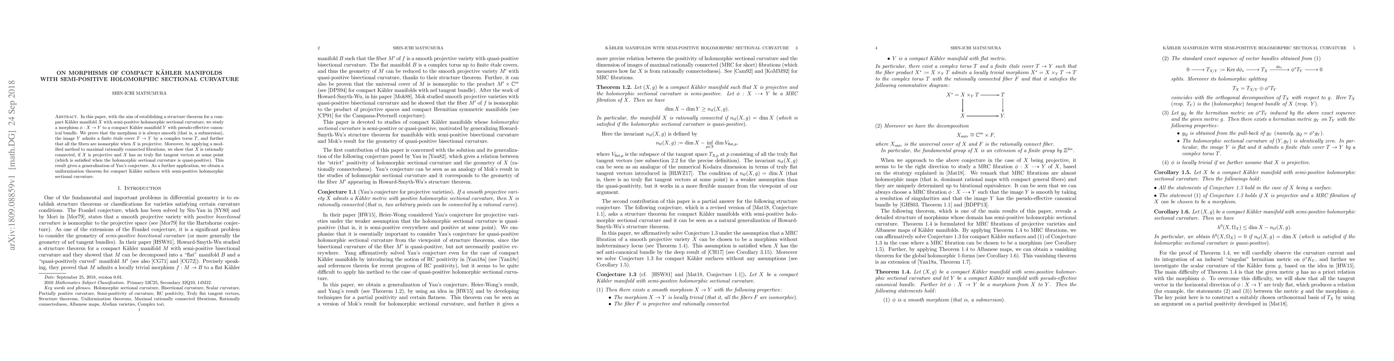 This paper establishes a structure theorem for compact Kähler manifolds with semi-positive holomorphic sectional curvature, proving that a morphism to a pseudo-effective canonical bundle manifold is smooth and that the fibers are isomorphic when projective. It also generalizes Yau's conjecture and provides a uniformization theorem for such surfaces.