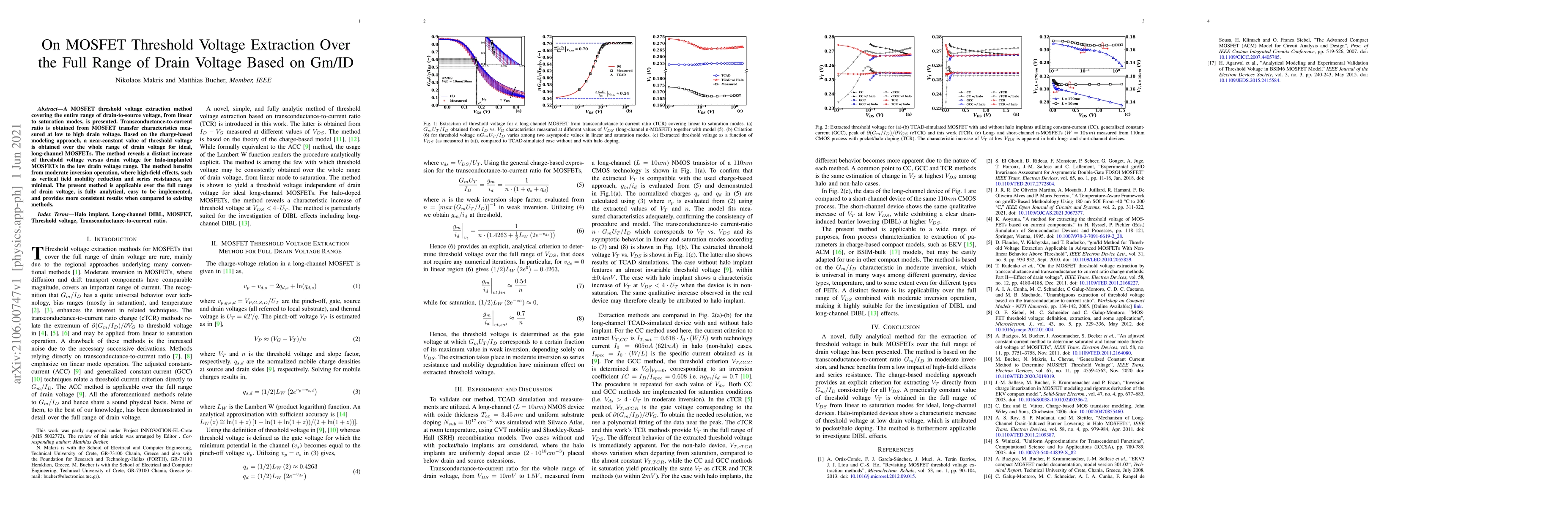 A MOSFET threshold voltage extraction method covering the entire range of drain-to-source voltage, from linear to saturation modes, is presented. Transconductance-to-current ratio is obtained from MOSFET transfer characteristics measured at low to high drain voltage. Based on the charge-based modeling approach, a near-constant value of threshold voltage is obtained over the whole range of drain voltage for ideal, long-channel MOSFETs. The method reveals a distinct increase of threshold voltage versus drain voltage for halo-implanted MOSFETs in the low drain voltage range. The method benefits from moderate inversion operation, where high-field effects, such as vertical field mobility reduction and series resistances, are minimal. The present method is applicable over the full range of drain voltage, is fully analytical, easy to be implemented, and provides more consistent results when compared to existing methods.