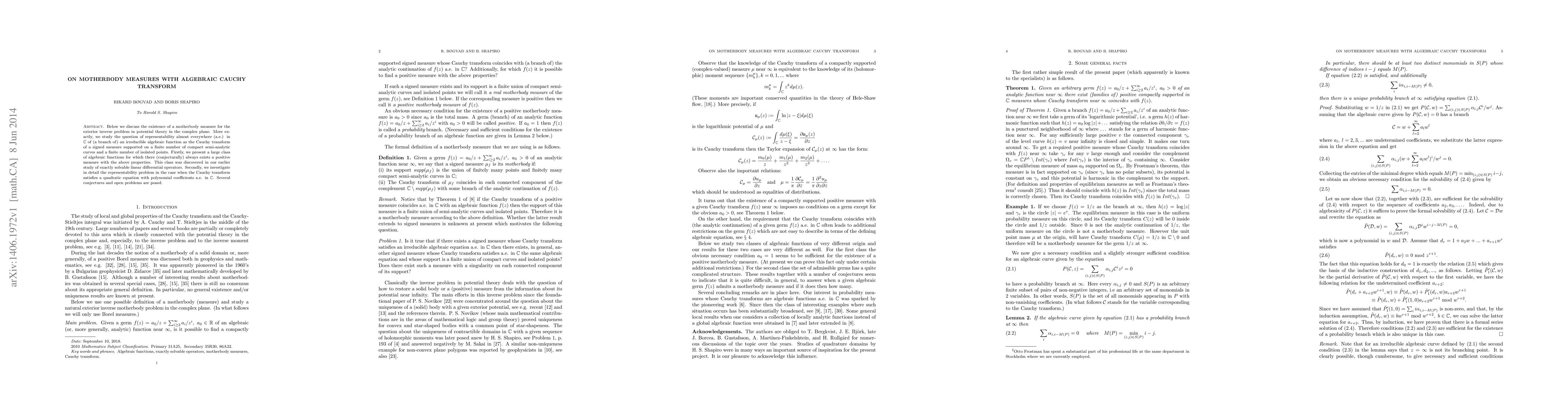 Below we discuss the existence of a motherbody measure for the exterior inverse problem in potential theory in the complex plane. More exactly, we study the question of representability almost everywhere (a.e.) in C of (a branch of) an irreducible algebraic function as the Cauchy transform of a signed measure supported on a finite number of compact semi-analytic curves and a finite number of isolated points. Firstly, we present a large class of algebraic functions for which there (conjecturally) always exists a positive measure with the above properties. This class was discovered in our earlier study %of the eigenpolynomials of exactly solvable linear differential operators. Secondly, we investigate in detail the representability problem in the case when the Cauchy transform satisfies a quadratic equation with polynomial coefficients a.e. in C. Several conjectures and open problems are posed.